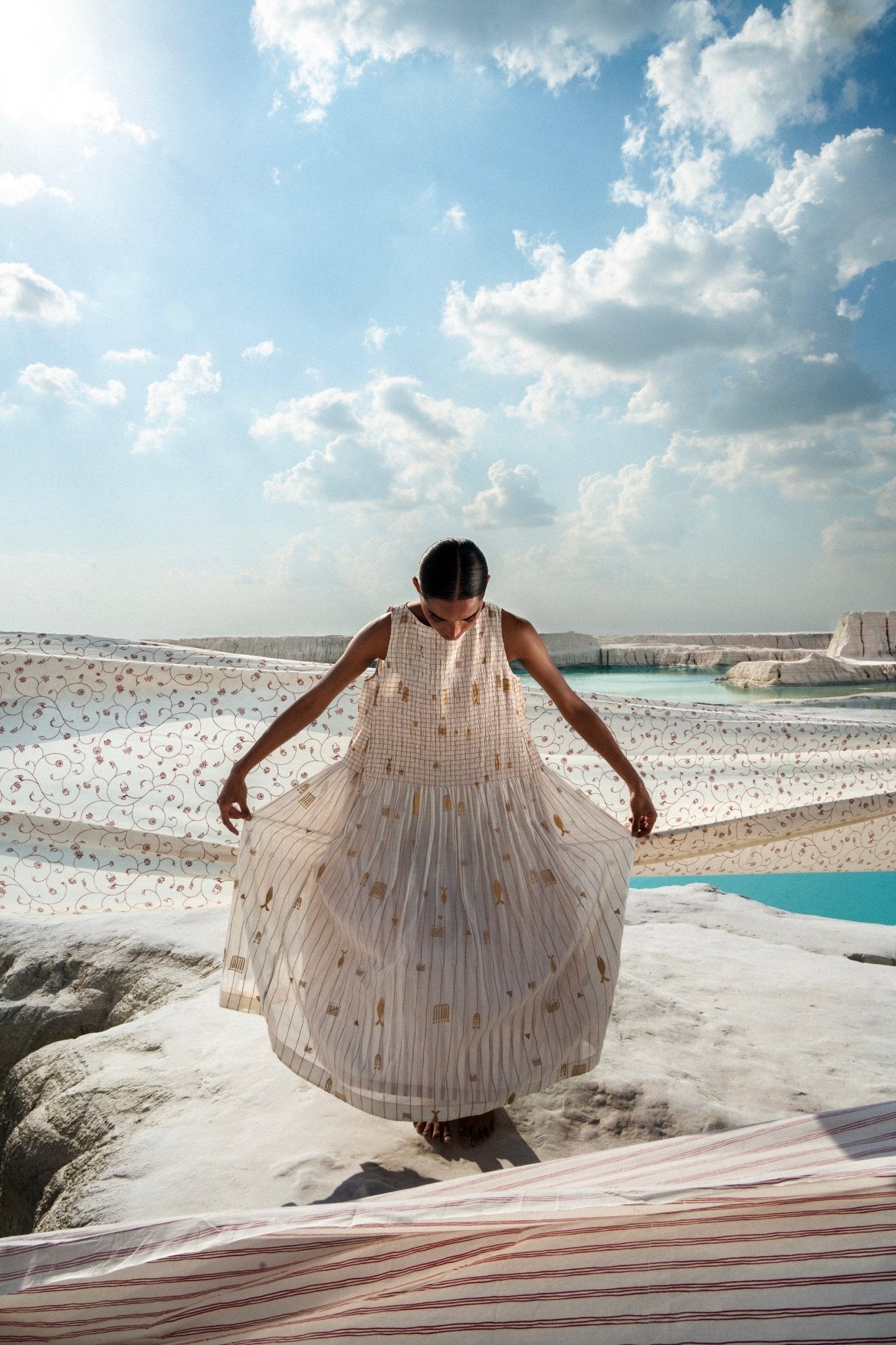 The Lay Ruching Dress marries refined aesthetics with everyday wearability through its thoughtful construction. Hand-screen-printed cotton silk forms the foundation, while delicate red-thread ruching introduces subtle movement and visual interest. A back button keyhole and concealed side pockets deliver practical elegance, allowing the fabric to drape with fluid grace across the silhouette.