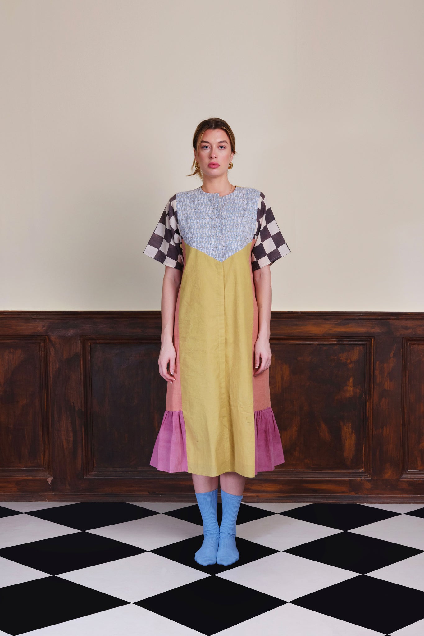 Elevate your wardrobe with the Painted by Moss Dress, a sophisticated high-neck shirt dress featuring a concealed placket, delicate pintucks, and short sleeves. Crafted from 100% cotton shell and lining, it showcases panels dyed with indigo, pomegranate, madder, and lac, enhanced by hand-painted sections in kassim. The indigo and kota doria pintuck panel is hand-embellished with brass sequins, creating an exquisite blend of traditional craftsmanship and contemporary design. Ideal for those who appreciate artisanal detail and refined style.