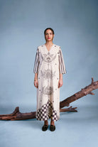 The Untitled Season Dress offers a sleek, straight silhouette with a V-neck, three-quarter sleeves, and a high slit for understated allure. Crafted from 100% cotton, it showcases mixed prints hand-painted in kassim and is delicately hand-embellished with brass sequins, blending artisanal detail with elegant design.