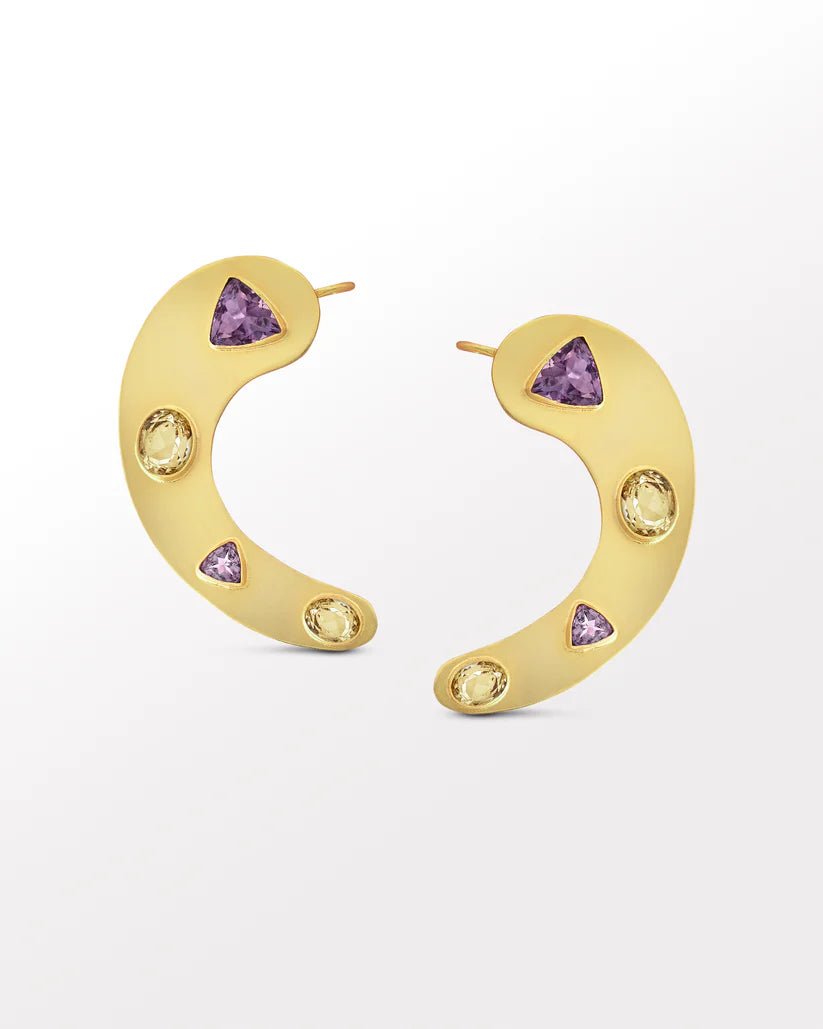 The Aami Earscape transcends conventional jewelry, a transformative piece that shifts between a striking earring and sculptural ear cuff. Its crescent silhouette traces a celestial arc along the ear, balancing substantial presence with graceful proportion. Faceted Amethyst, Lemon Topaz, and Citrine sit in precise bezel settings, selected for their luminous clarity and intuitive resonance. Crafted in Sun Gold with a satiny matte finish, the piece contrasts soft surfaces against high-polished bezels and the natural radiance of gemstones.