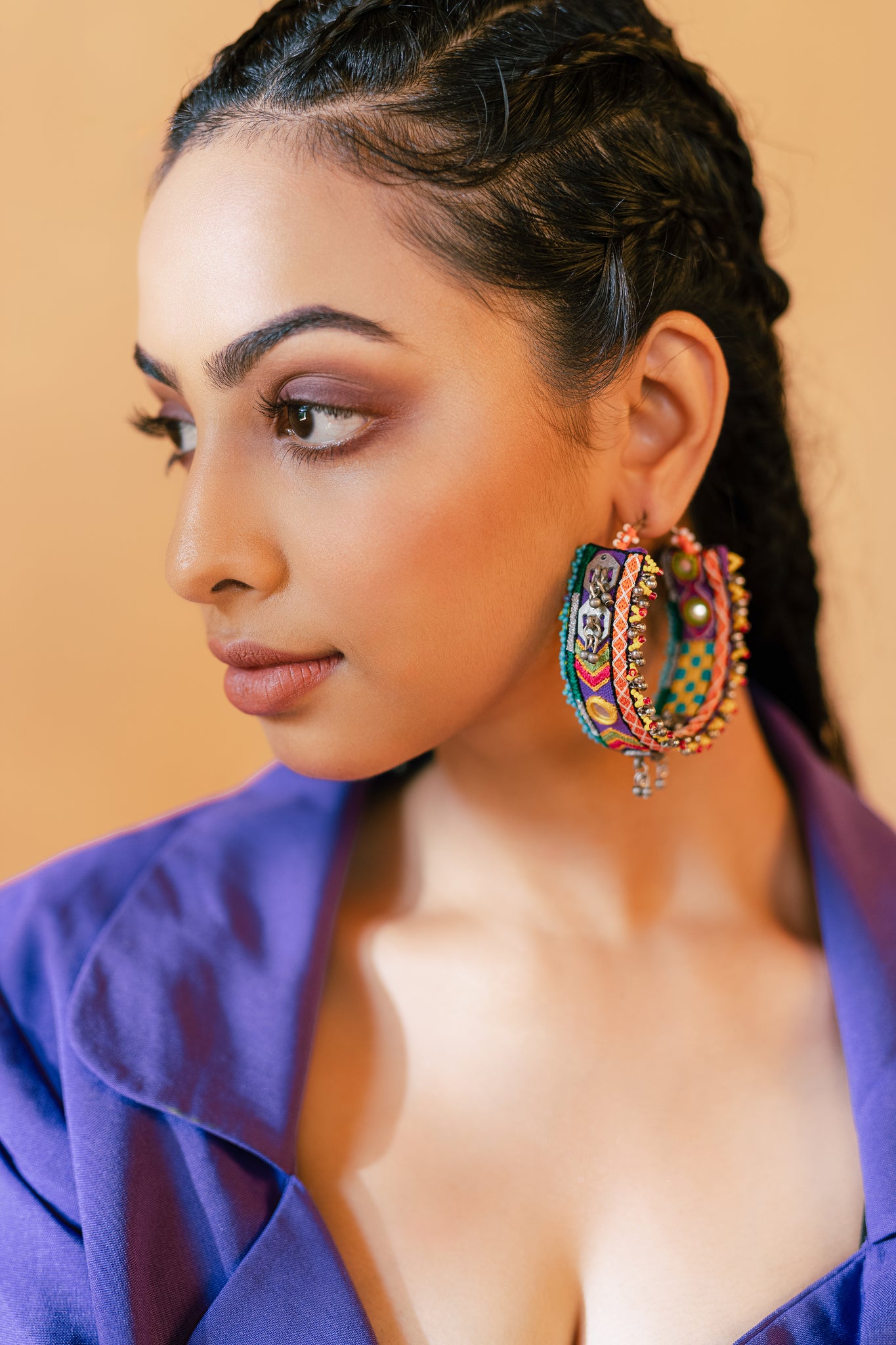 Our earrings are crafted using ethical processes and innovative materials like Brass, German Silver, Dupion Silk, Upcycled Leather, Semi-Precious Stones, Beads, Ceramic, Paper Mache, and Wood. These materials are manipulated with techniques such as Textile Manipulation, Ceramic Art, and Metalwork, resulting in designs inspired by nature, traditional Pichwai art, and modern deco elements.