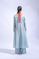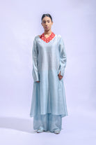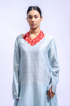 Ice-blue handwoven kurta set with flowing A-line silhouette and wide trousers, elevated by signature golden zari button and cross detailing. Includes a contrasting red polka top for understated elegance.