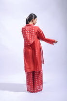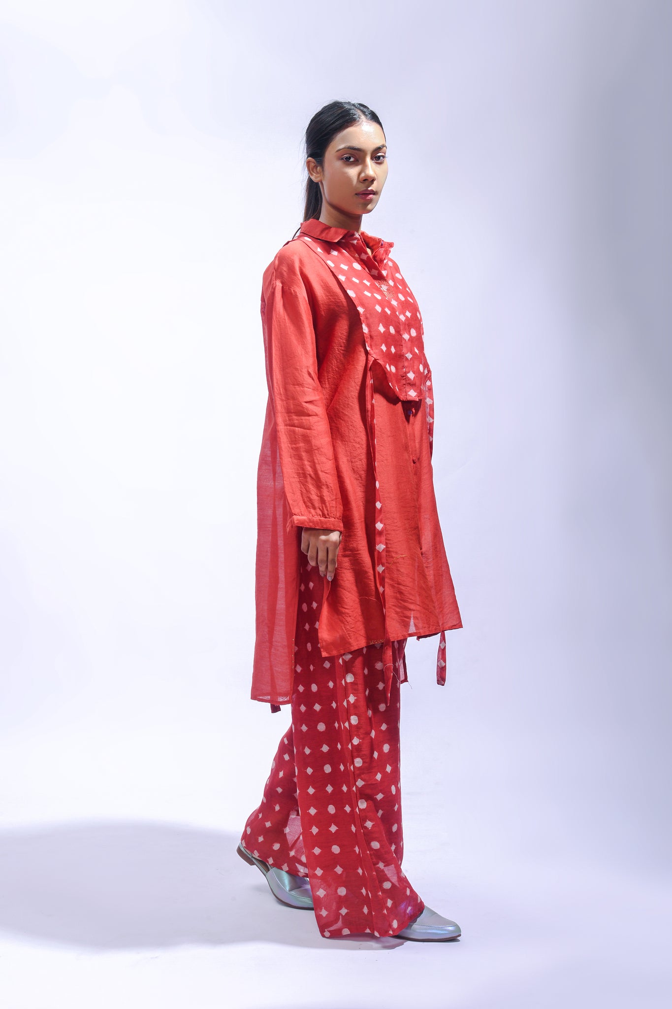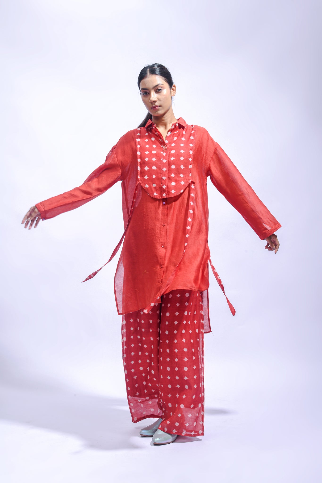 A hand block–printed co-ord set crafted in soft  cotton silk, featuring our signature mud-resist print. The relaxed shirt with a detachable yoke pairs seamlessly with fluid printed pants, balancing structure and ease. Each piece is finished with our signature handwork of button and cross with golden zari, celebrating the artistry of handcraft in a modern silhouette.