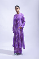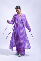 A fluid festive ensemble in soft cotton-silk, featuring a hand block-printed slit kurta with a detachable yoke and coordinated lined pants. Lightweight yet statement-making, the silhouette moves with ease — a play of form and flow in violet geometry.