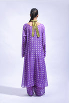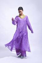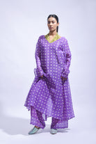 Hand block-printed in soft lilac, this three-piece set combines a flowing slit kurta, fluid trousers, and contrasting lime bralette. Crafted from cotton silk with golden zari embroidery and cross-stitch detailing, it merges traditional artisanal techniques with modern design for understated elegance.