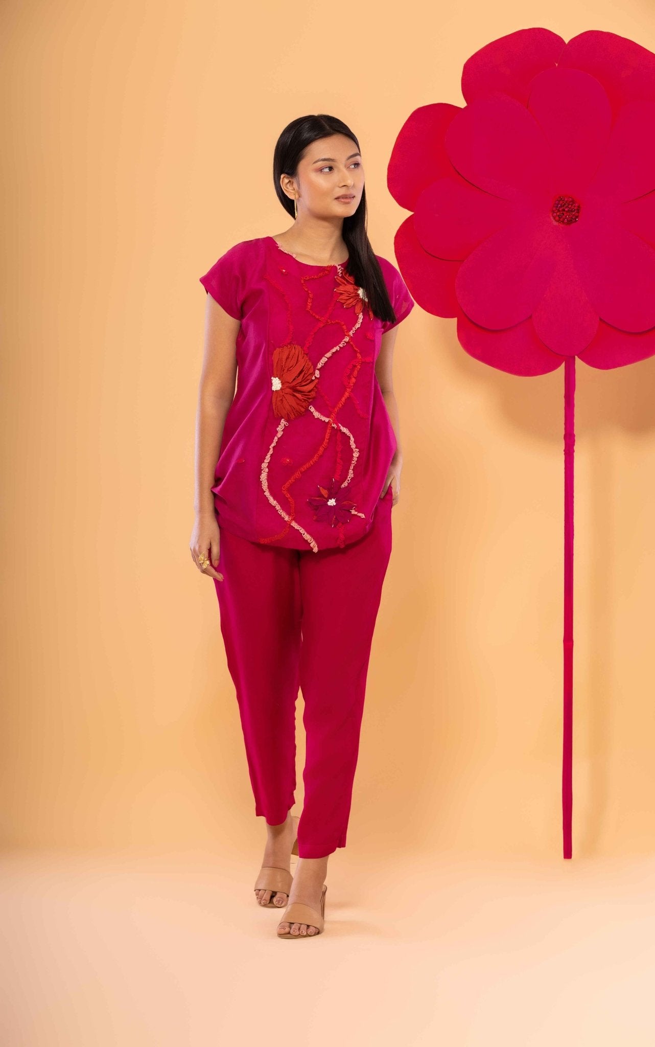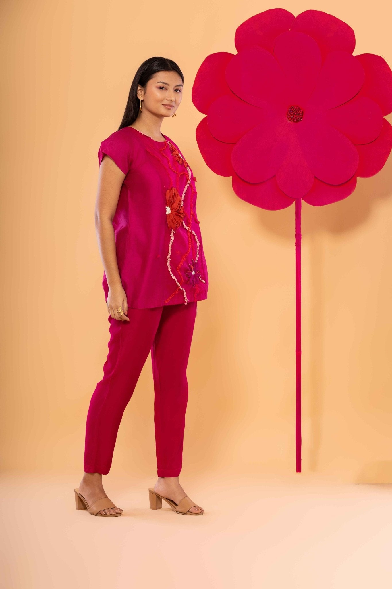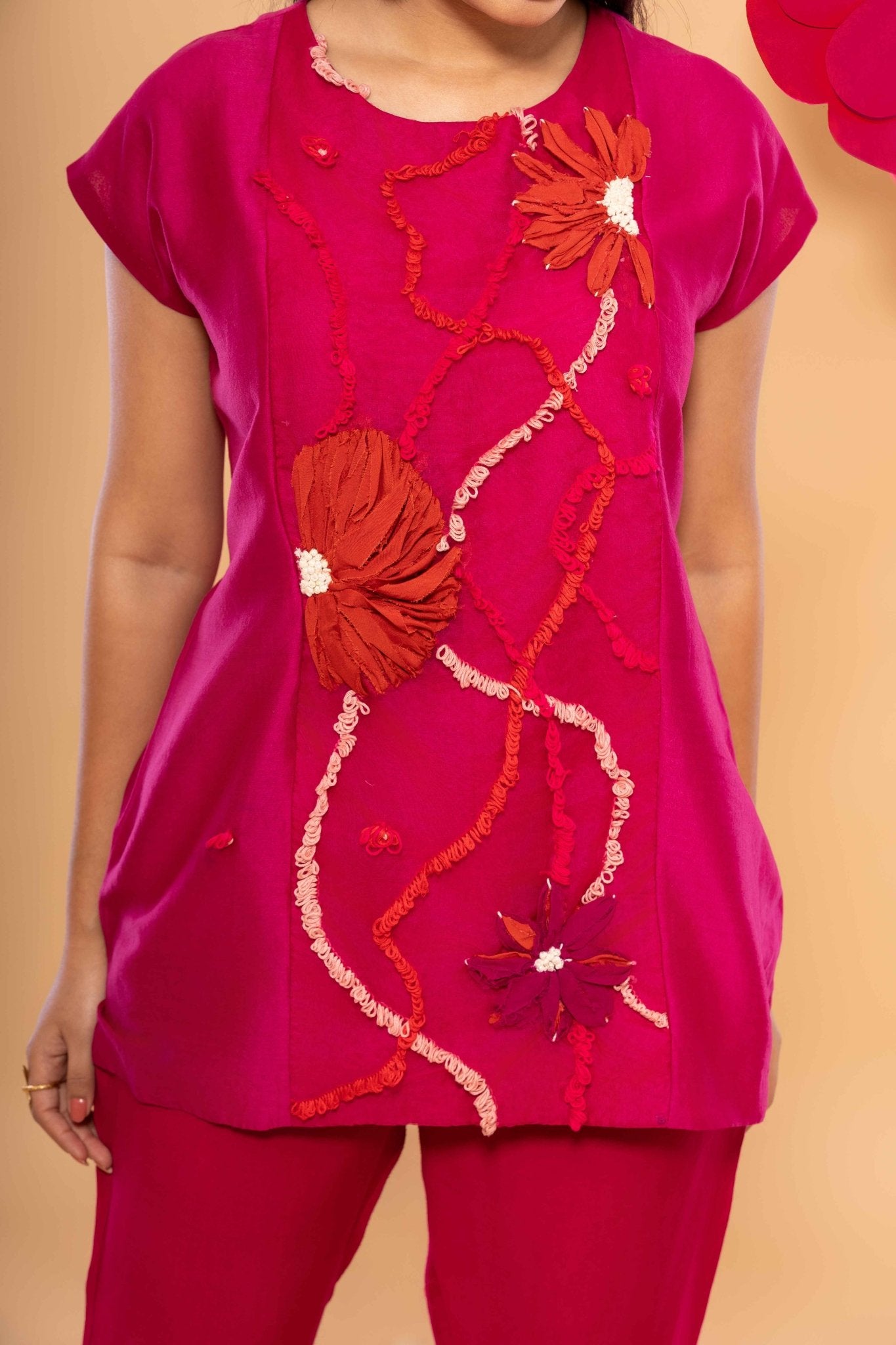 Elevate your wardrobe with the luxurious Cara Set. The delicate punch needle and fabric embroidery create a unique texture, while the relaxed fit, drop shoulder top and elasticated, drawstring pants provide effortless comfort. Made with handwoven Chanderi and all-weather silk, this exclusive set is available in a vibrant hot pink hue. Ethically and consciously made for the discerning customer.