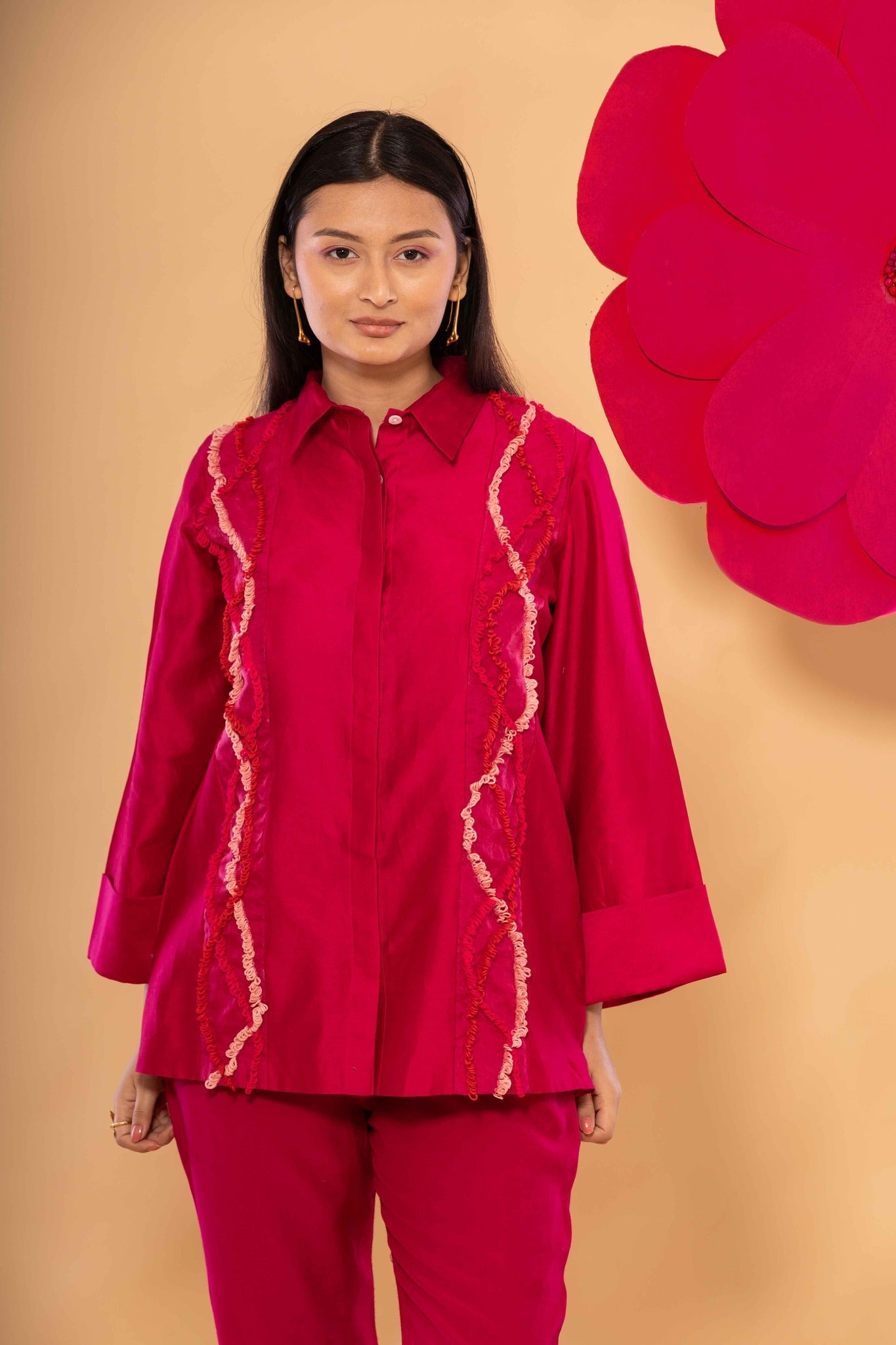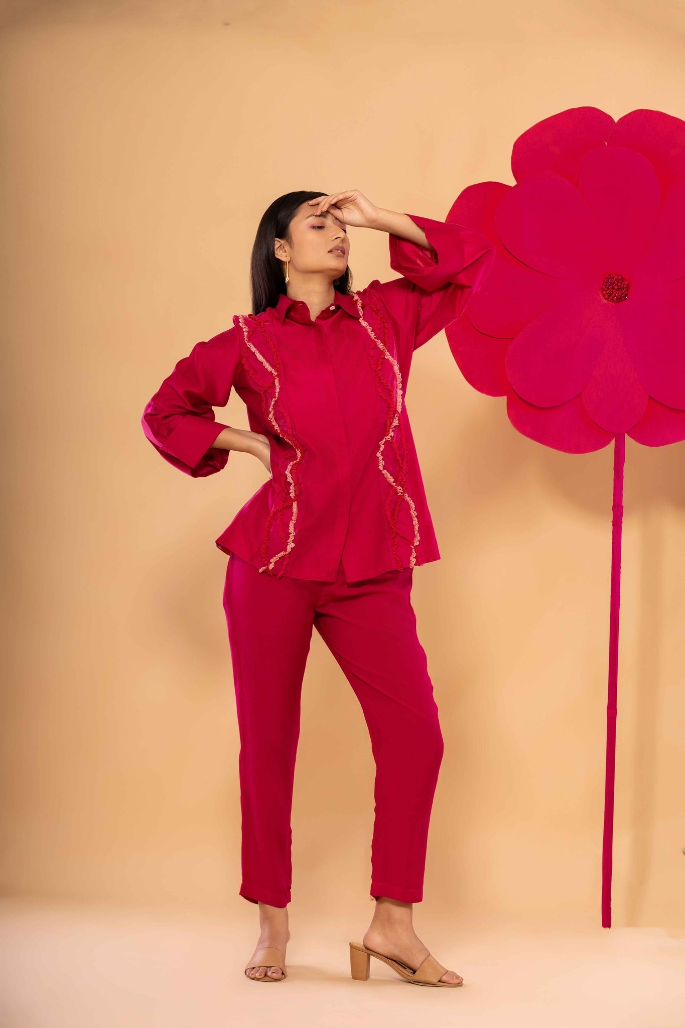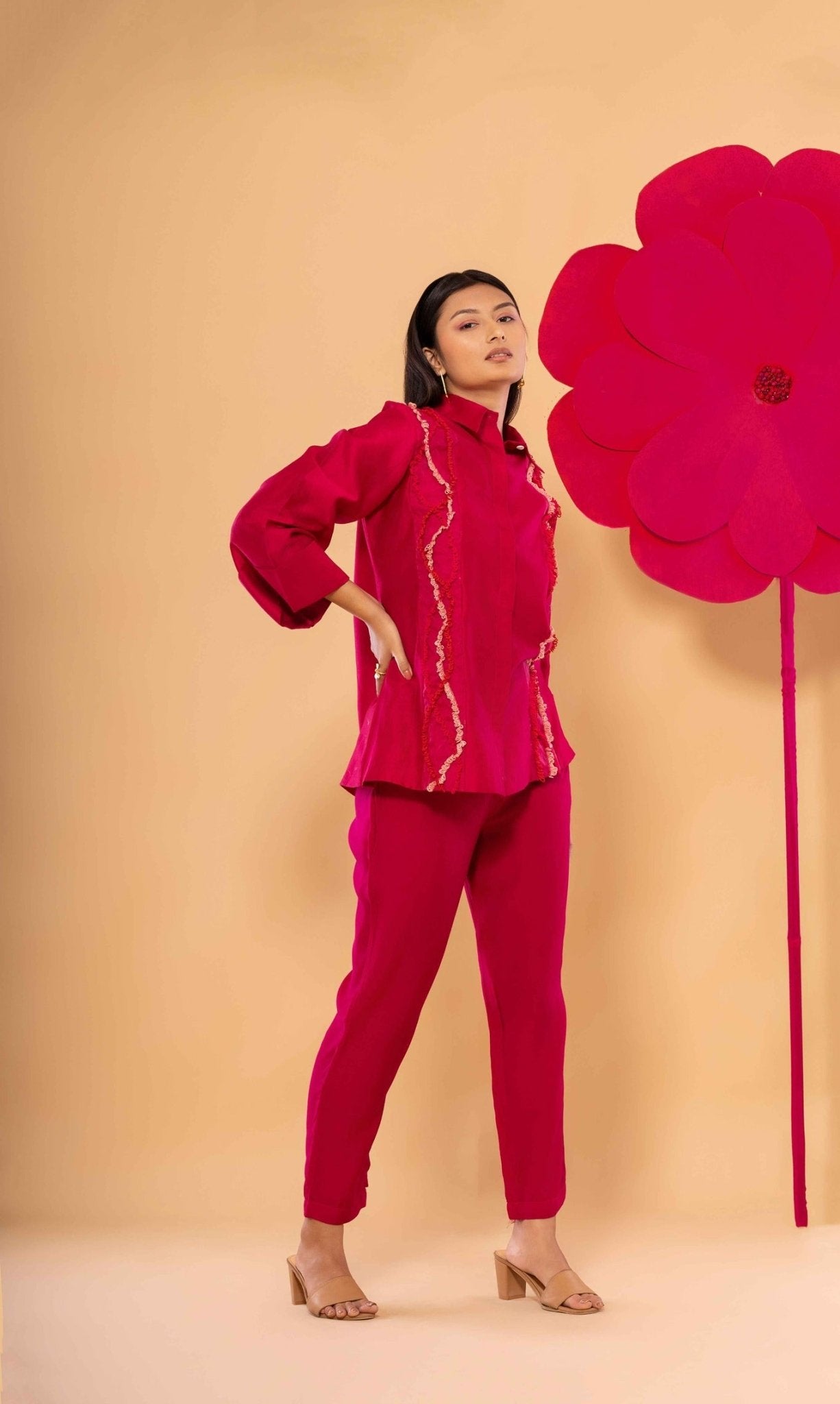 Indulge in luxury with the Darcy Set. The delicate Punch Needle embroidery and pure Handwoven Chanderi Silk elevate the buttoned down SHIRT, while the relaxed fit and concealed placket add a touch of exclusivity. The PANTS, made of pure All weather Silk, feature an elasticated back and concealed drawstring for comfort, with a touch of sophistication in the ankle length. Ethically and consciously made for the tasteful and exclusive consumer.