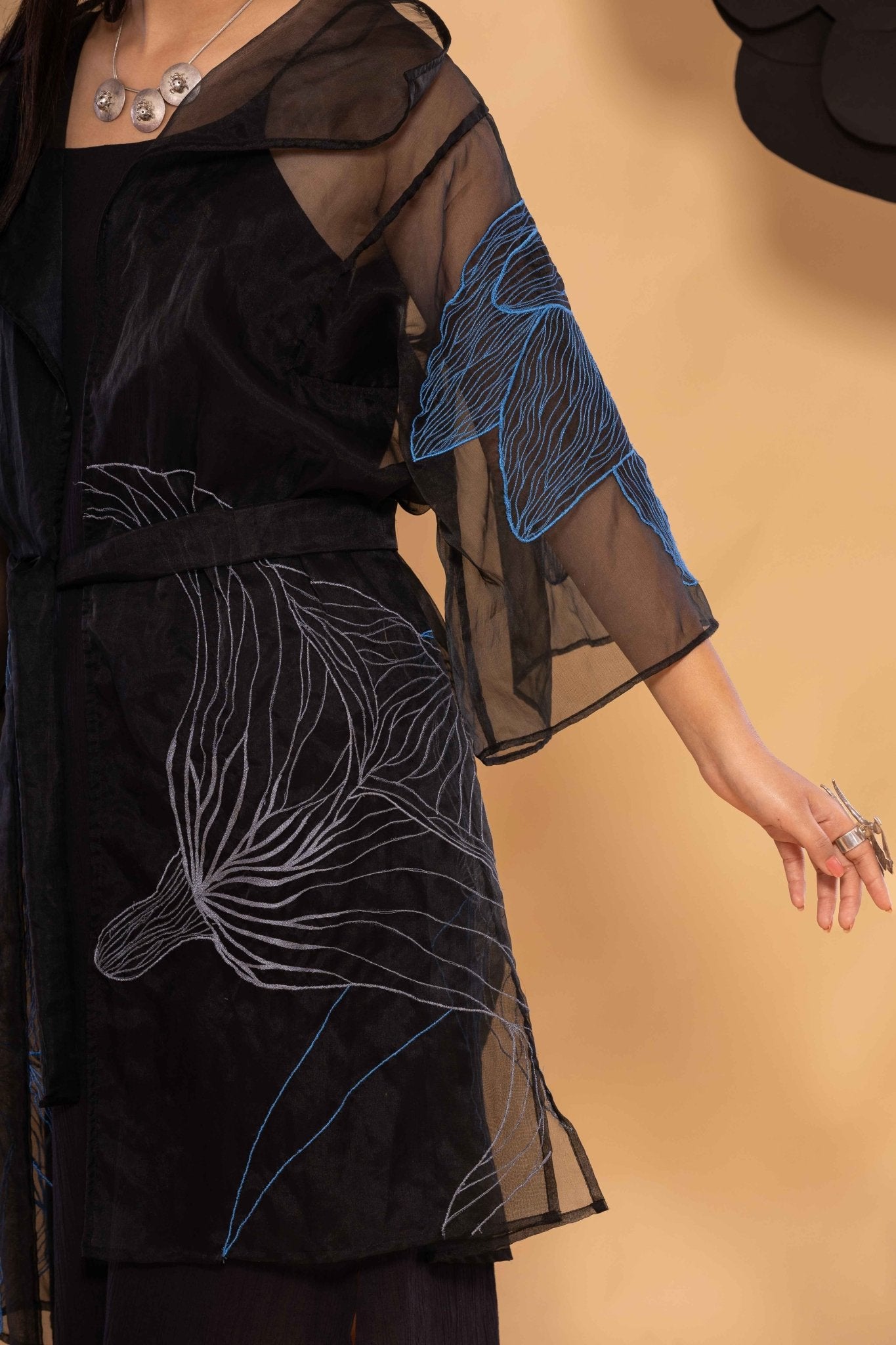 Indulge in luxury with the Lila Set, featuring a front open jacket with an exaggerated collar and boxy fit. The delicate 'Resham thread' embroidery adds a touch of elegance to the pure all-weather silk organza fabric. The matching slip dress with noodle straps and side slit is made with all-weather crush cotton and lined with skin-friendly cotton mul. Ethically made and consciously crafted for an exclusive and timeless look.
