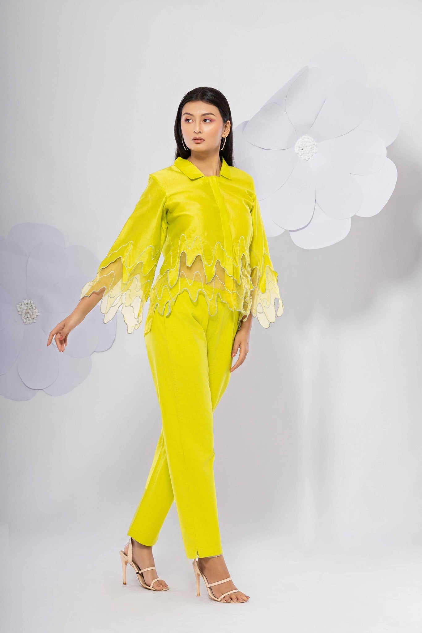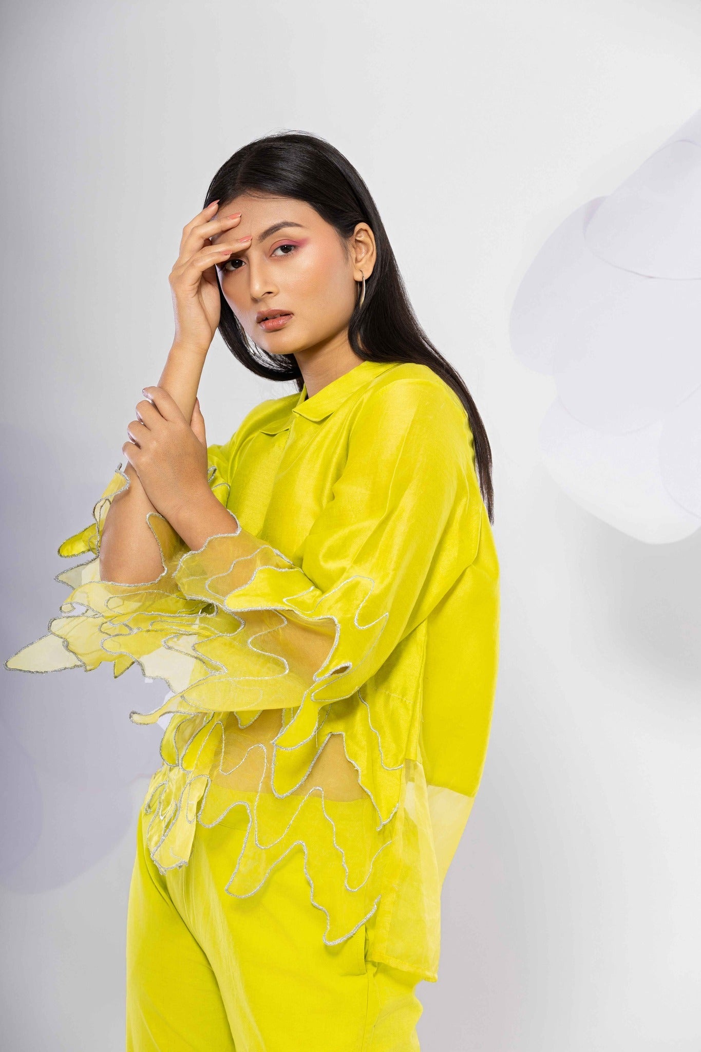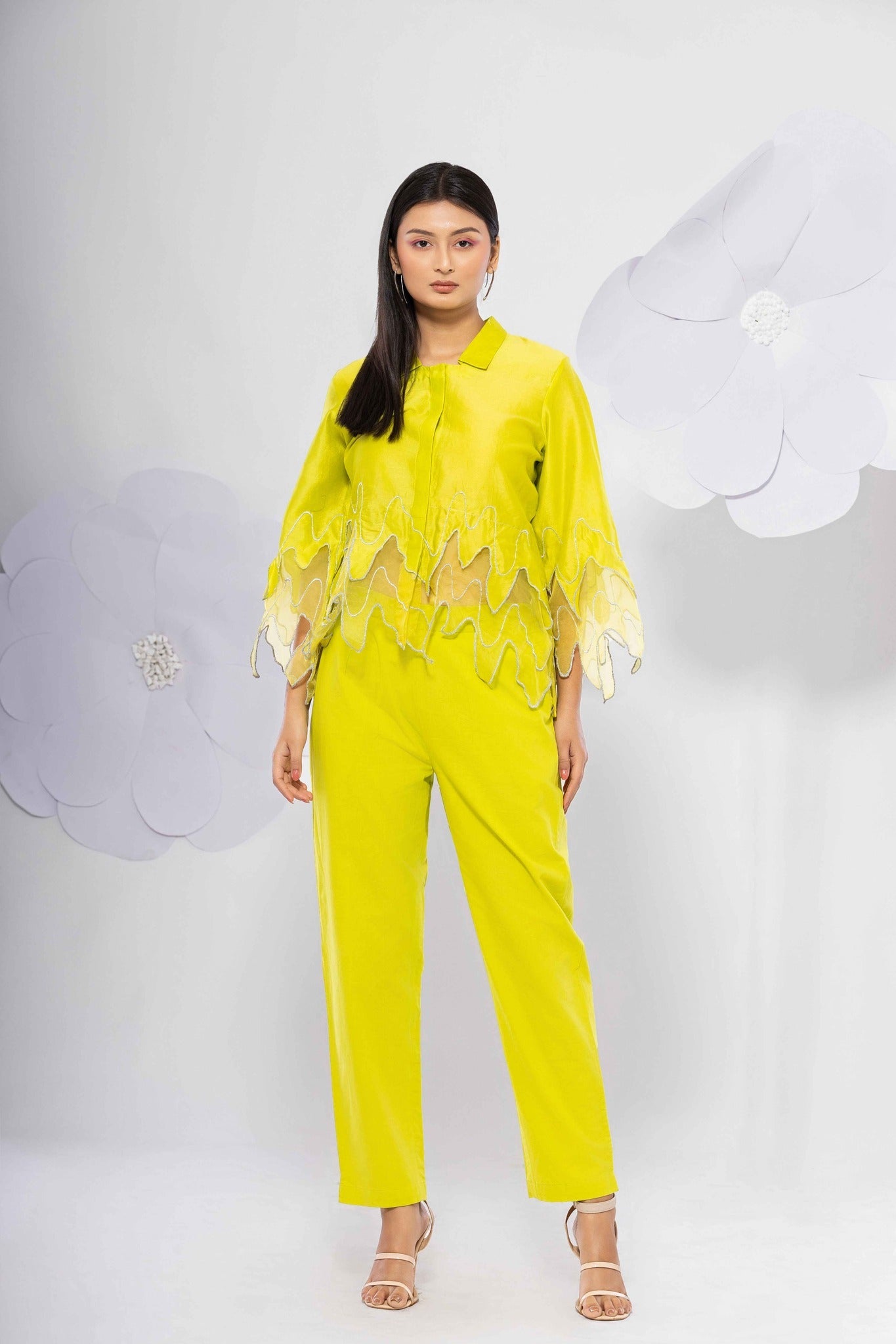 Introducing the Liza Set, a statement of luxury and sophisticated taste. The lime green shirt features intricate Resham thread embroidery, a buttoned down design, and a comfortable fit. Made with handwoven Chanderi Silk and plant-based Organza, ethically and consciously crafted. The matching pants boast an elasticated back and drawstring front, with a straight, ankle-length fit. Made with pure, all-weather silk for effortless elegance.