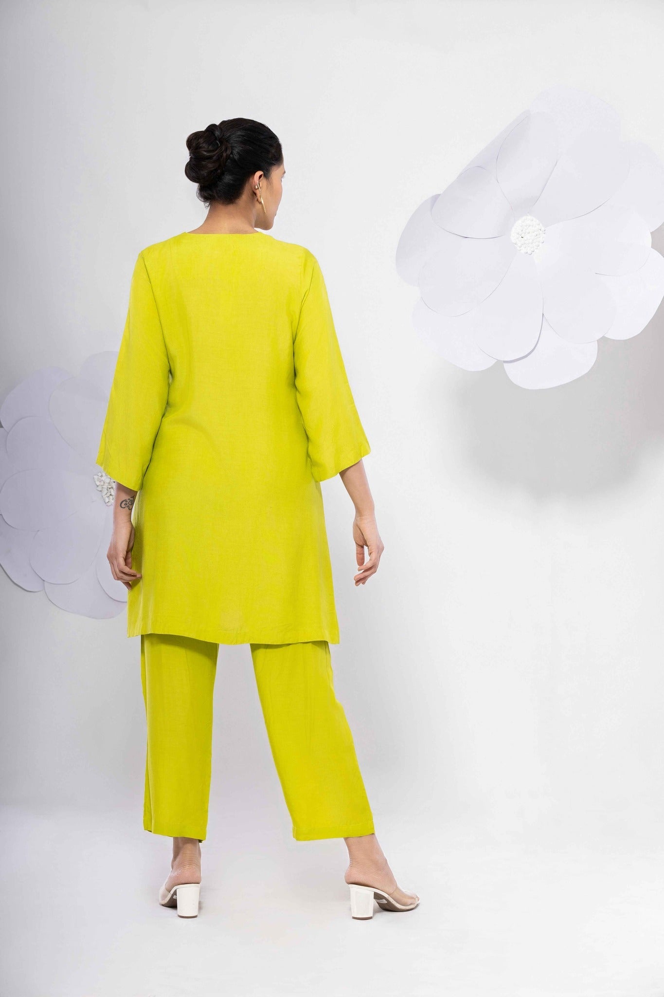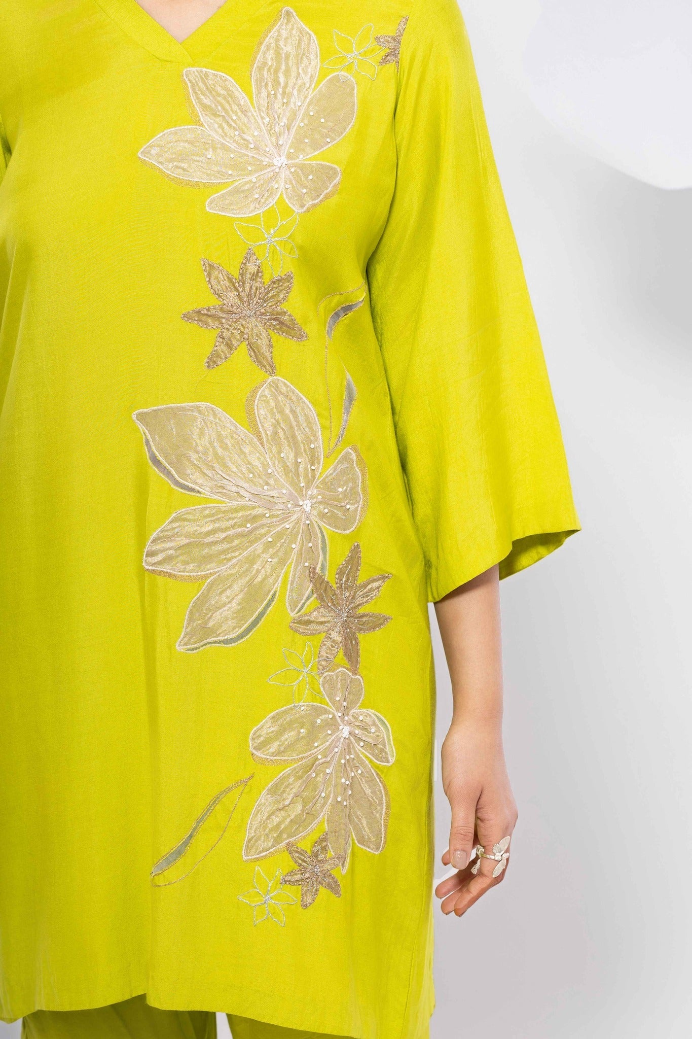 Elevate your style with the Nina Set. The signature floral applique, delicate bead work, and intricate resham and Kasab embroidery make this kurta a true luxury piece. The V-neck and lime green color add a touch of elegance. Made with pure all-weather silk, this ethically made set is both comfortable and conscious. The elasticated back and drawstring front of the pants ensure a perfect fit, while the side pockets add functionality. Experience sophistication and exclusivity with the Nina Set.