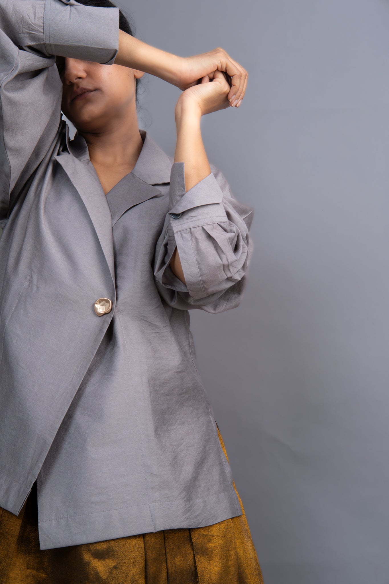 A handwoven Chanderi co-ord featuring a silver patchwork drop-shoulder shirt with side slits and a gold knife-pleated skirt with pockets and a concealed zip. Understated, luxurious, and timeless — festive elegance with everyday ease.