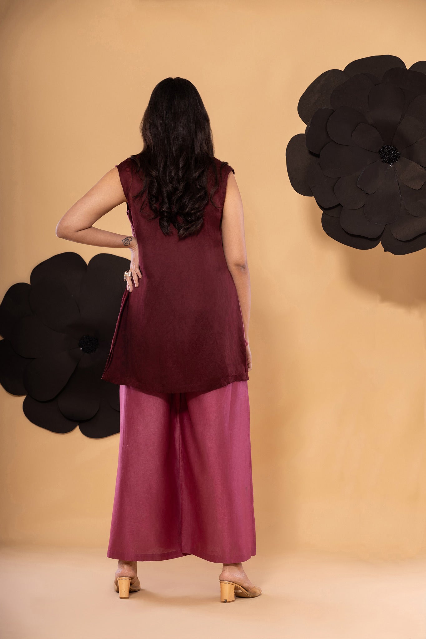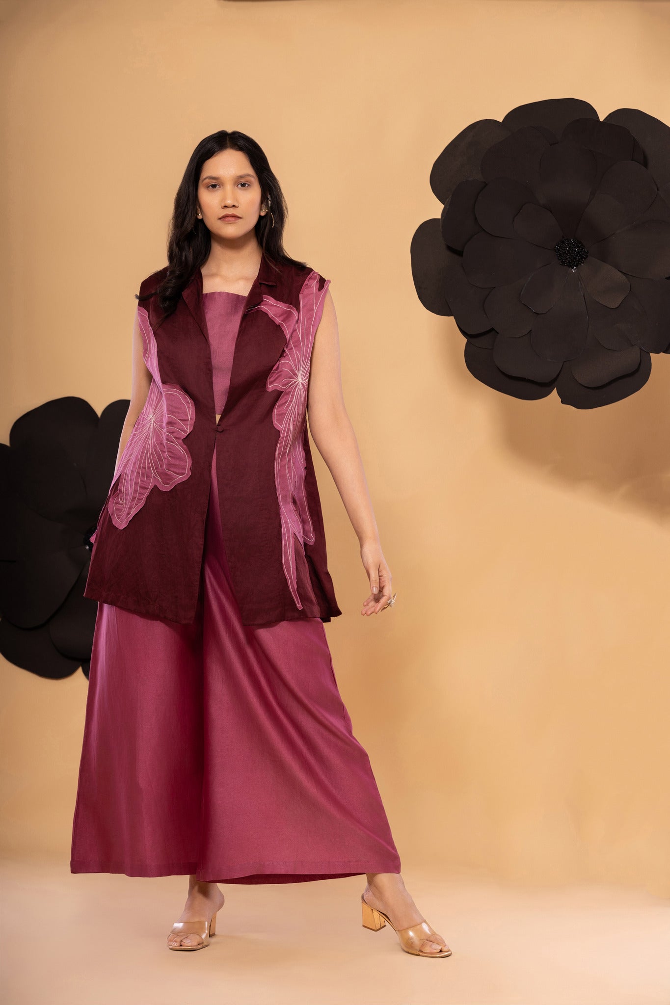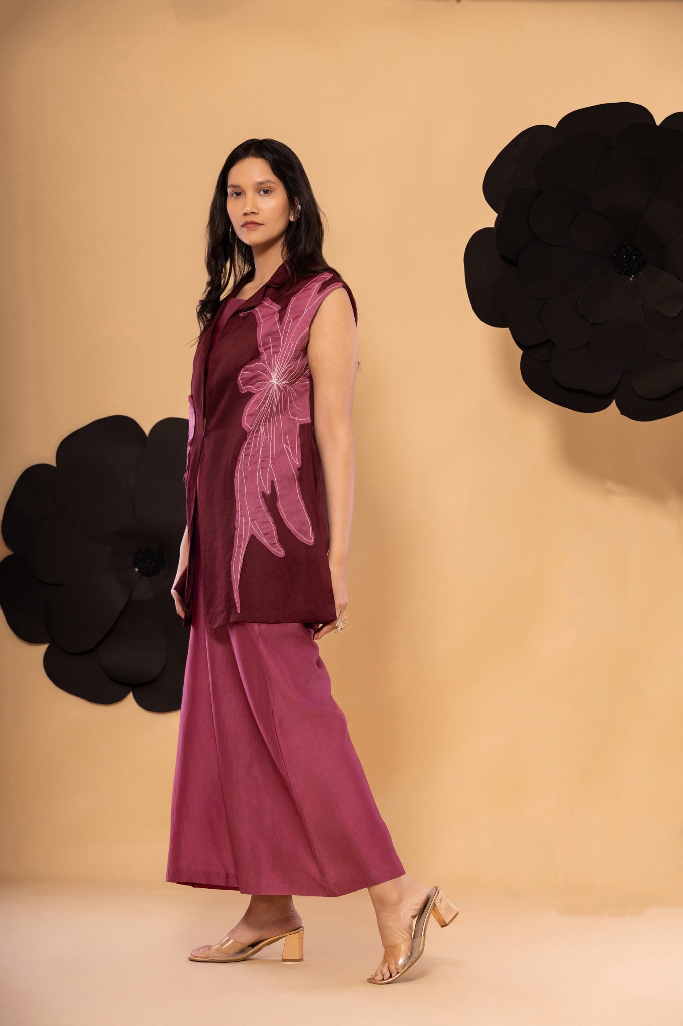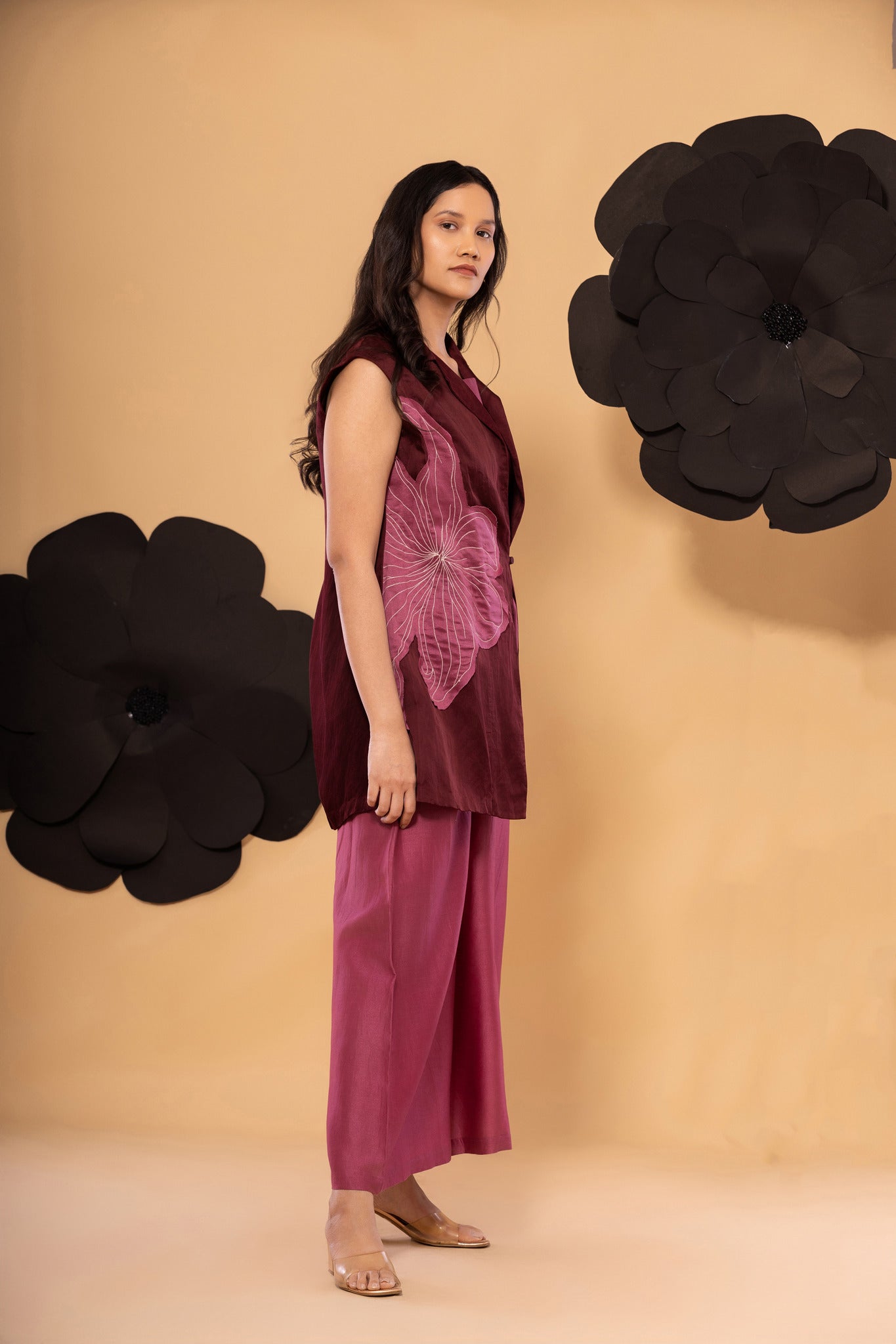 Introducing the luxurious Venus Set, a sophisticated ensemble that exudes elegance and exclusivity. The front open blazer features delicate applique work with resham embroidery, while the wine-coloured pure silk linen fabric adds a touch of luxury. The bustier, made with handwoven Chanderi silk, features a princess style and is lined with soft cotton mul. The high-waisted flared pants, also made with Chanderi silk, are consciously made and half-lined with cotton mul for comfort. Elevate your style with this ethically made set. Available in pale pink.