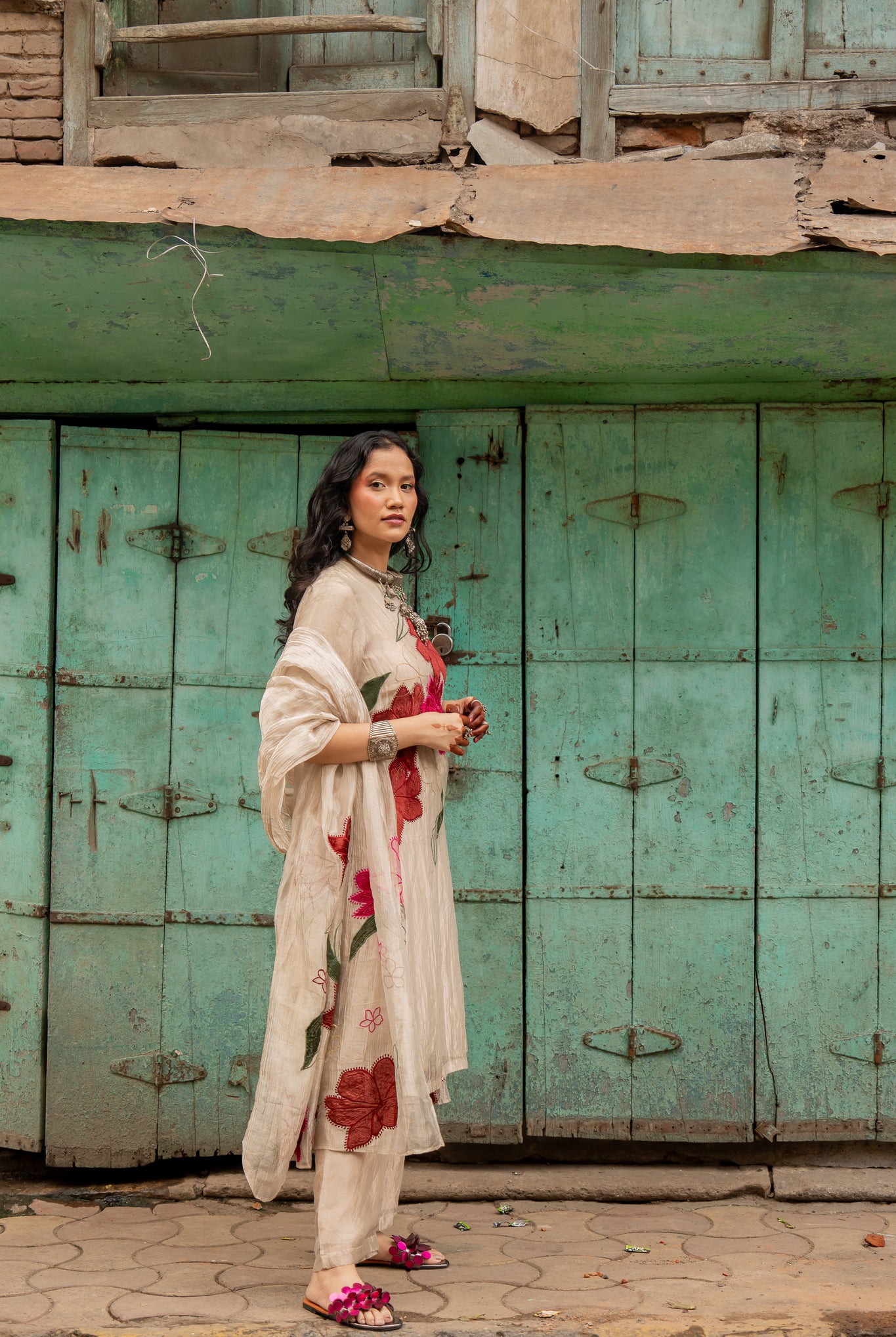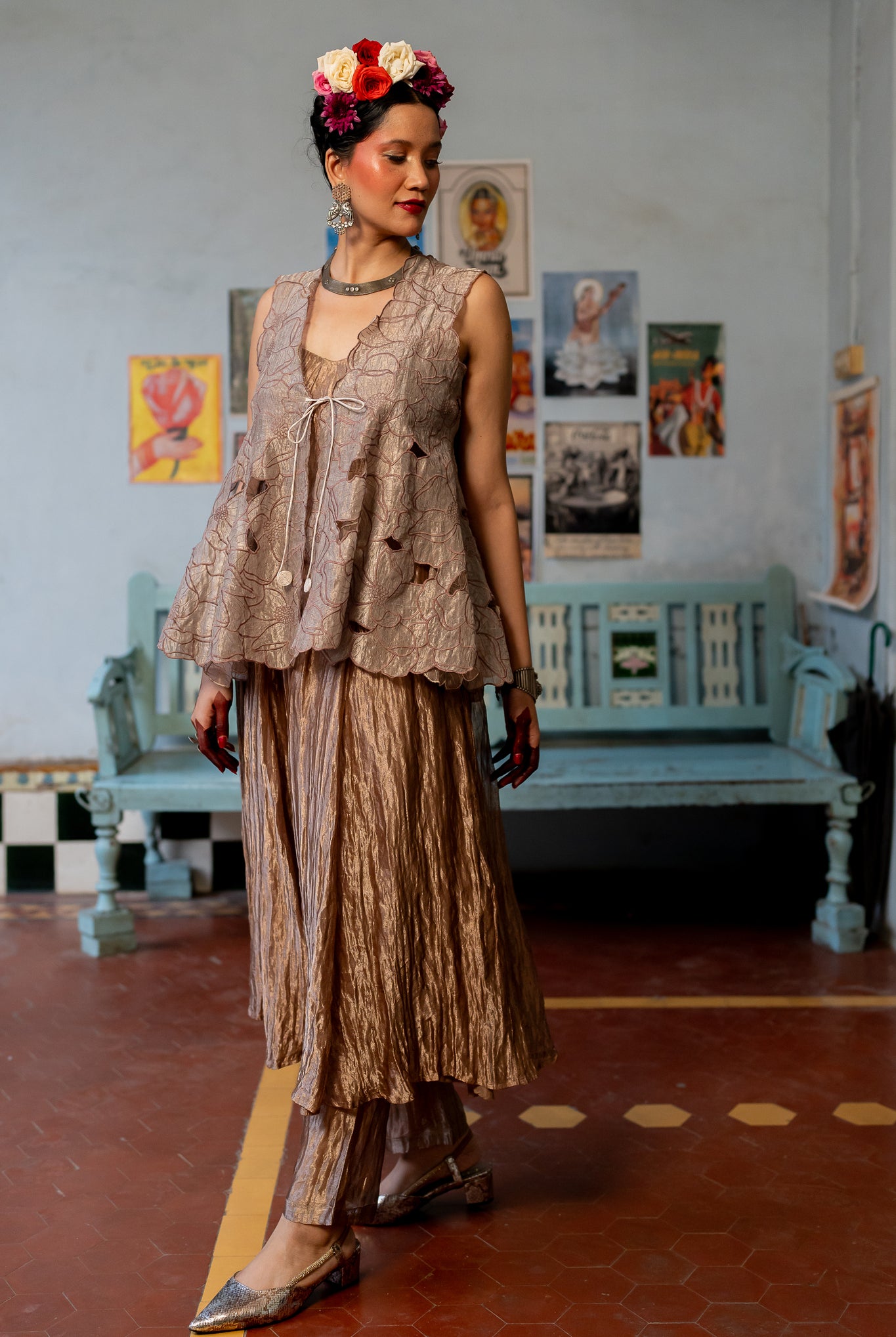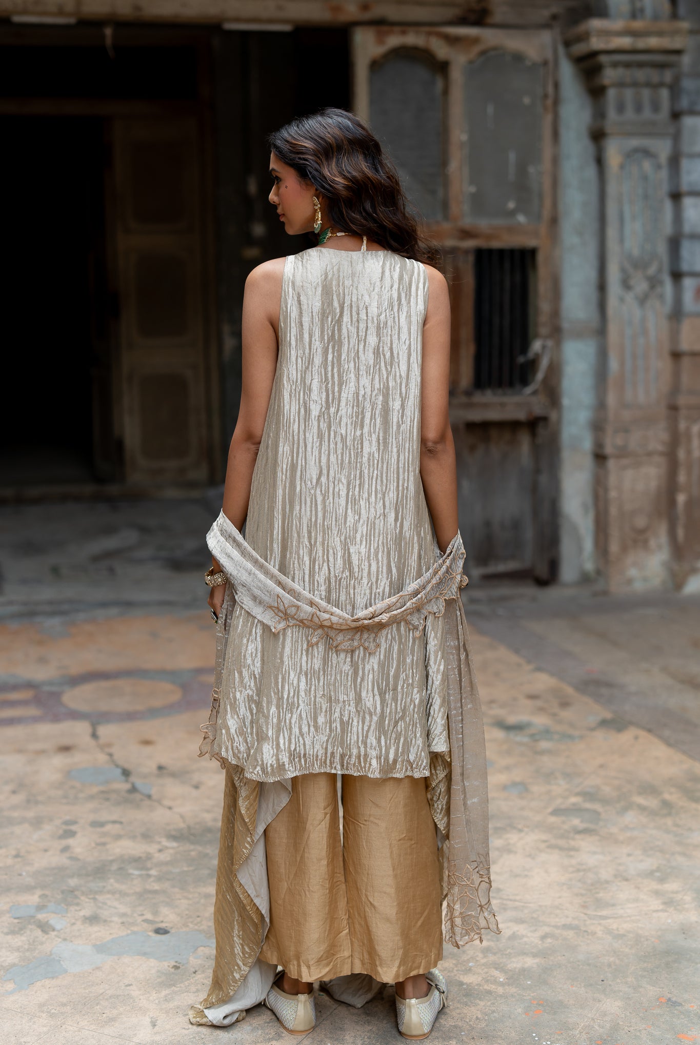 Introducing the Raji Set - a luxurious and exclusive ensemble fit for any occasion. This set includes a sleeveless statement jacket with resham thread embroidery, a voluminous anarkali kurta made with pure Banarasi silk tissue and lined with soft cotton, and high-waisted, straight-leg pants with a concealed drawstring. Comfort meets elegance with this plant-based organza and cotton silk set.