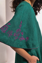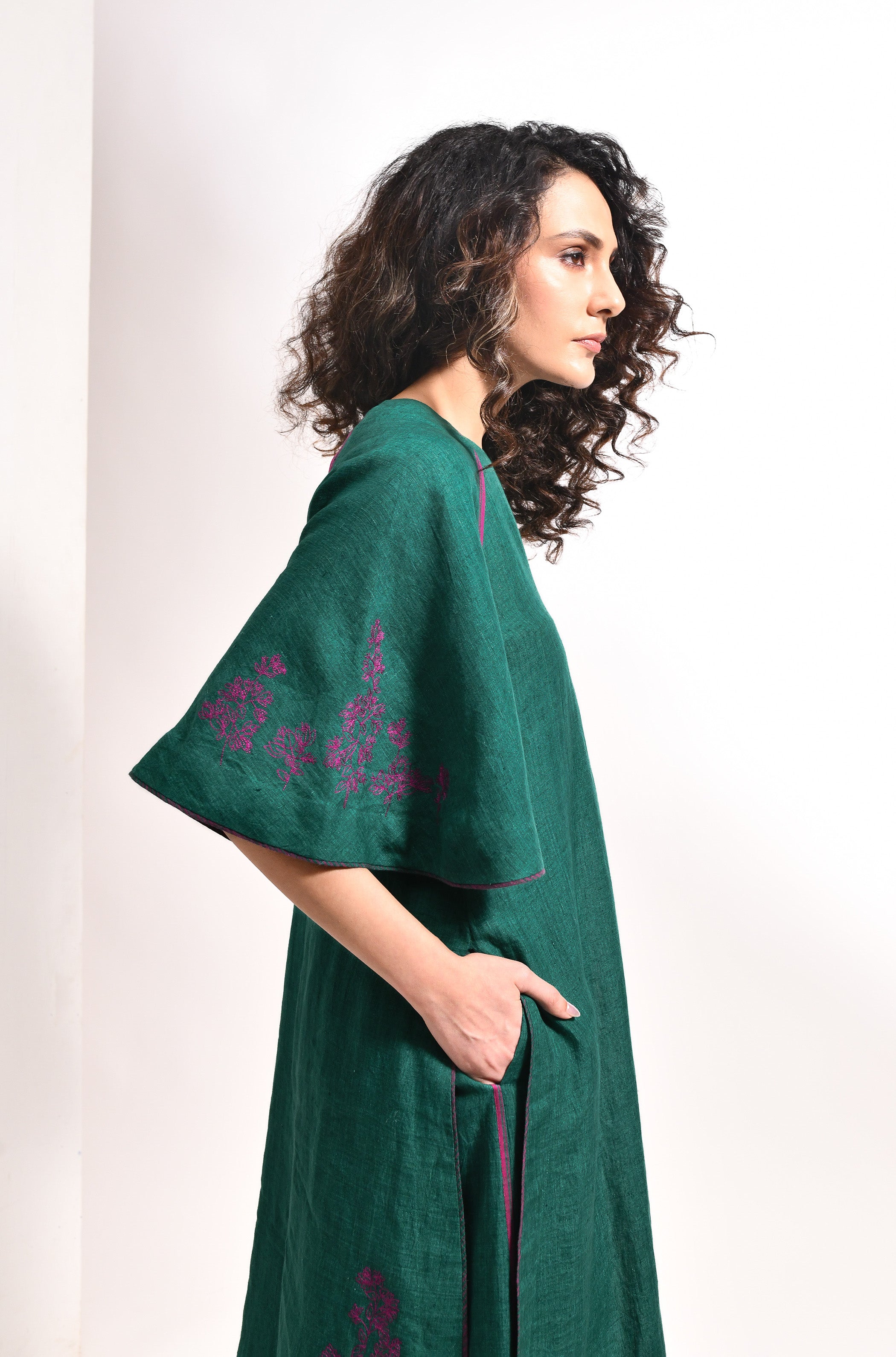 The Bell Set epitomizes understated luxury through thoughtful design. This linen ensemble features gracefully proportioned raglan sleeves, allowing unrestricted movement. The kurta is adorned with delicate Bougainvillea embroidery gracing both front and back, complemented by a meaningful quote detail that adds personal resonance. Rendered in forest green, the kurta pairs seamlessly with solid trousers finished with refined contrast piping.