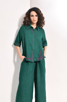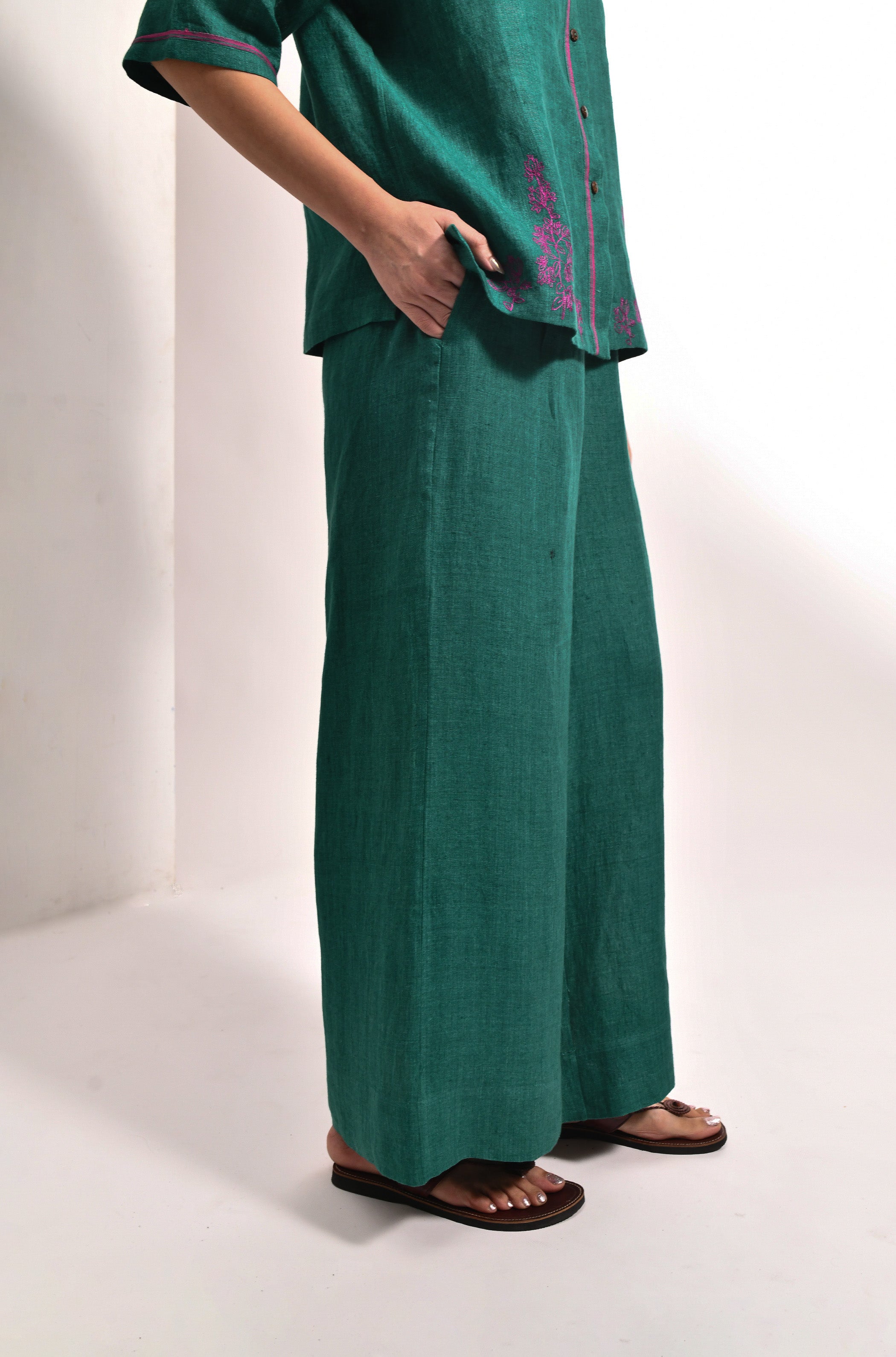 Indulge in the sophistication and exclusivity of The Maya Set in Forest Green. Crafted from luxurious linen, this co-ord set boasts a relaxed silhouette with delicate Bougainvillea embroidery and a Maya Angelou quote. The loose crop shirt pairs perfectly with the flared trousers featuring a comfortable zip and elastic back. Make a statement with ease and practicality.