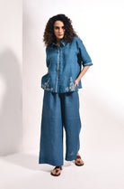 The Maya Set in French Blue is a luxurious linen co-ord set that effortlessly moves with you. The loose crop shirt boasts elegant Bougainvillea embroidery and a powerful Maya Angelou quote at the back. Paired with long flared trousers, the front zip and back elastic provide a comfortable yet stylish fit. This sophisticated and exclusive set combines feminine ease with a strong visual identity.