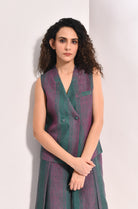 Discover geometric sophistication with The Rosa Set in Forest green linen. This curated ensemble reimagines classic tailoring through modern design, a striped waistcoat with directional panels pairs seamlessly with overlap trousers crafted without traditional side seams. The result is an effortlessly refined silhouette that balances structure with fluidity.