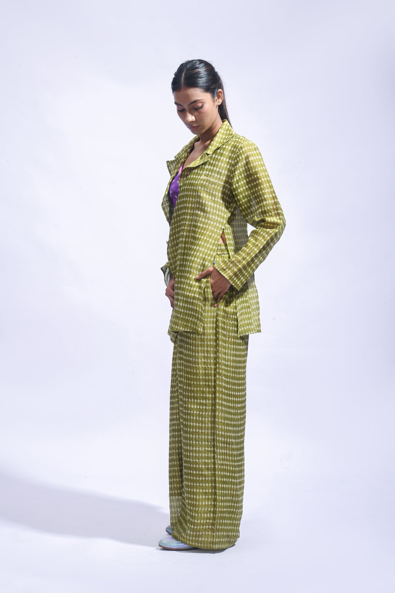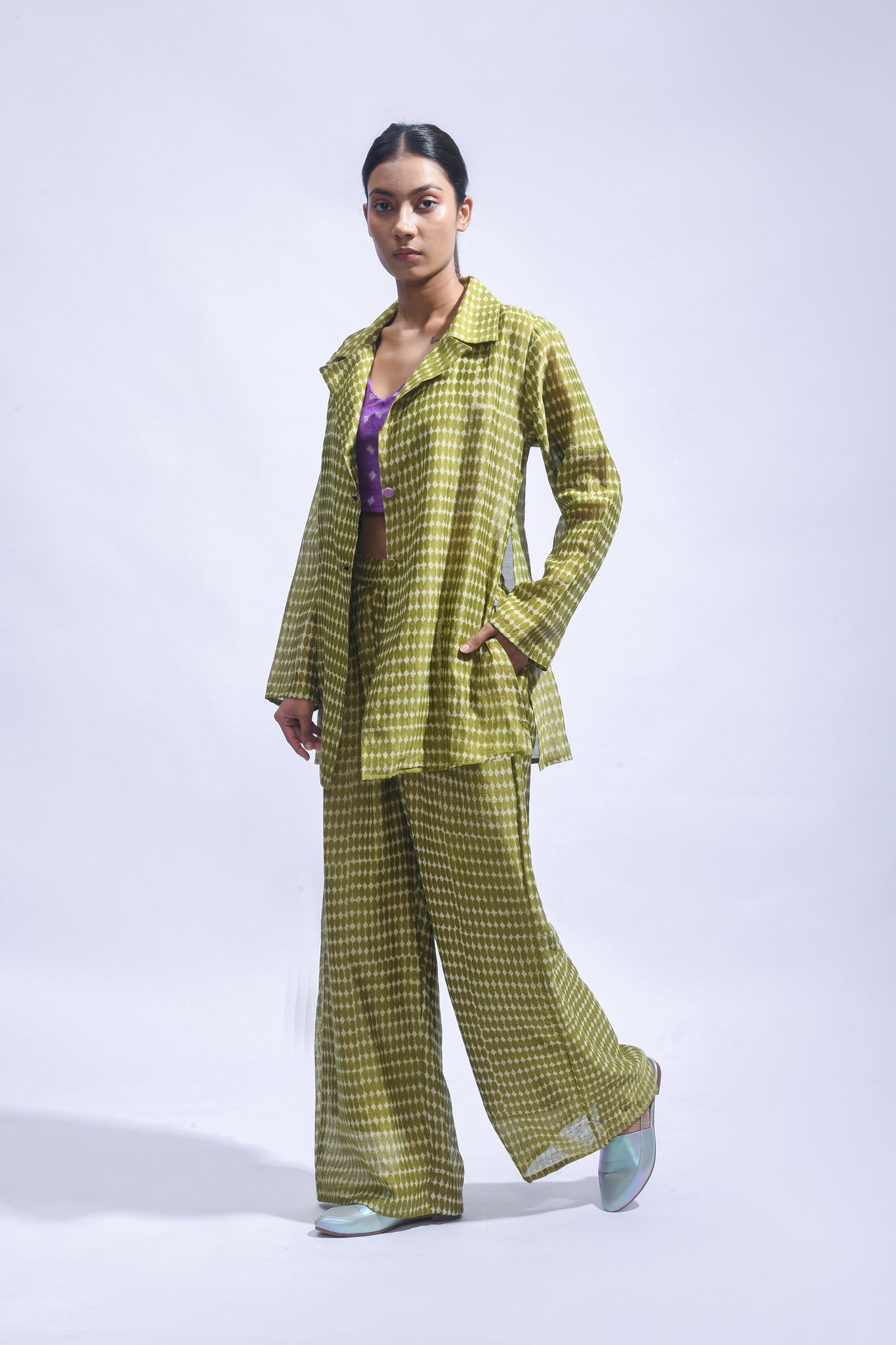 A play of color blocking and texture, featuring a lime hand block–printed silk set an easy blazer and wide trousers layered with a contrasting lilac bralette. The ensemble merges relaxed tailoring with feminine sharpness, creating a dialogue between structure and spontaneity.All prints are hand block–printed with mud, celebrating artisanal geometry in a modern silhouette.