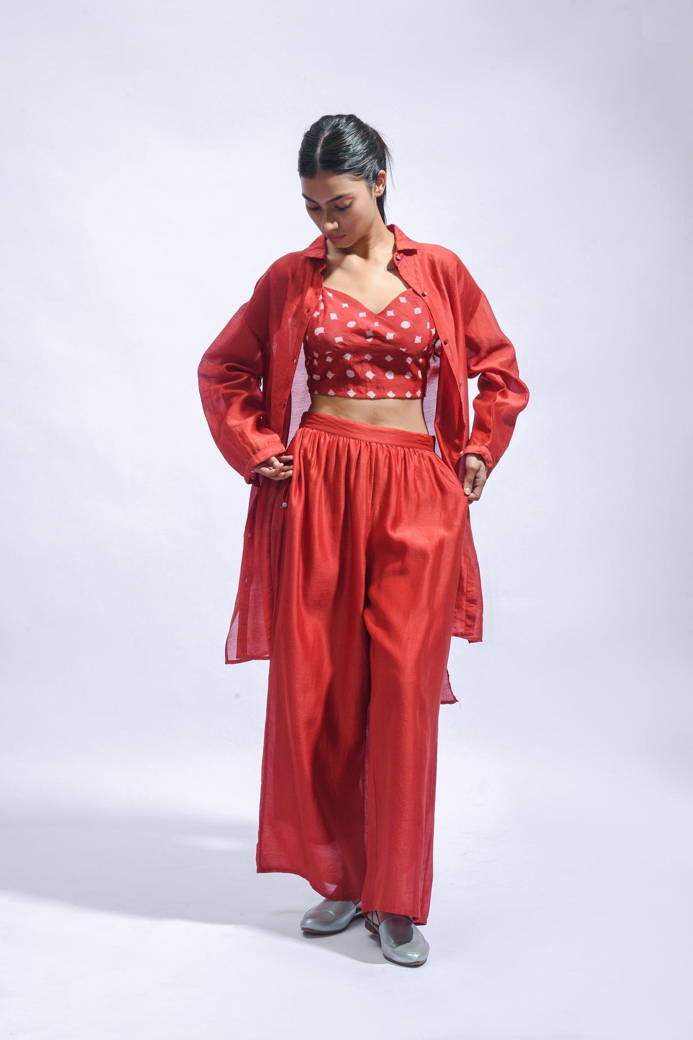 An effortless co-ord set in  silk, featuring a red block-printed bralette, a breezy overshirt, and fluid silk trousers. The silhouette moves with ease, relaxed yet precise in its tailoring.