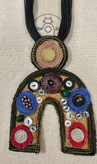 Discover artisanal sophistication in this limited edition horseshoe neckpiece, where layered textures and rich colors converge. Meticulously assembled from upcycled fabric scraps, vintage beads, buttons, and coins, each element adds depth and character to this one-of-a-kind pendant. Suspended from black waxed cotton cords, it's a bold statement for those who embrace individuality and celebrate the beauty of handcrafted, sustainable design.