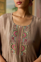 Embrace effortless elegance with the Holly Kaftan, a flowing silk masterpiece that celebrates traditional craftsmanship. The relaxed silhouette drapes beautifully while the intricate bandhani print and hand-embroidered yoke create an understated yet striking presence. Crafted from luxurious 100% silk, this brown kaftan transitions seamlessly from festive celebrations to intimate gatherings, offering both comfort and refined style for those who appreciate artisanal detail.