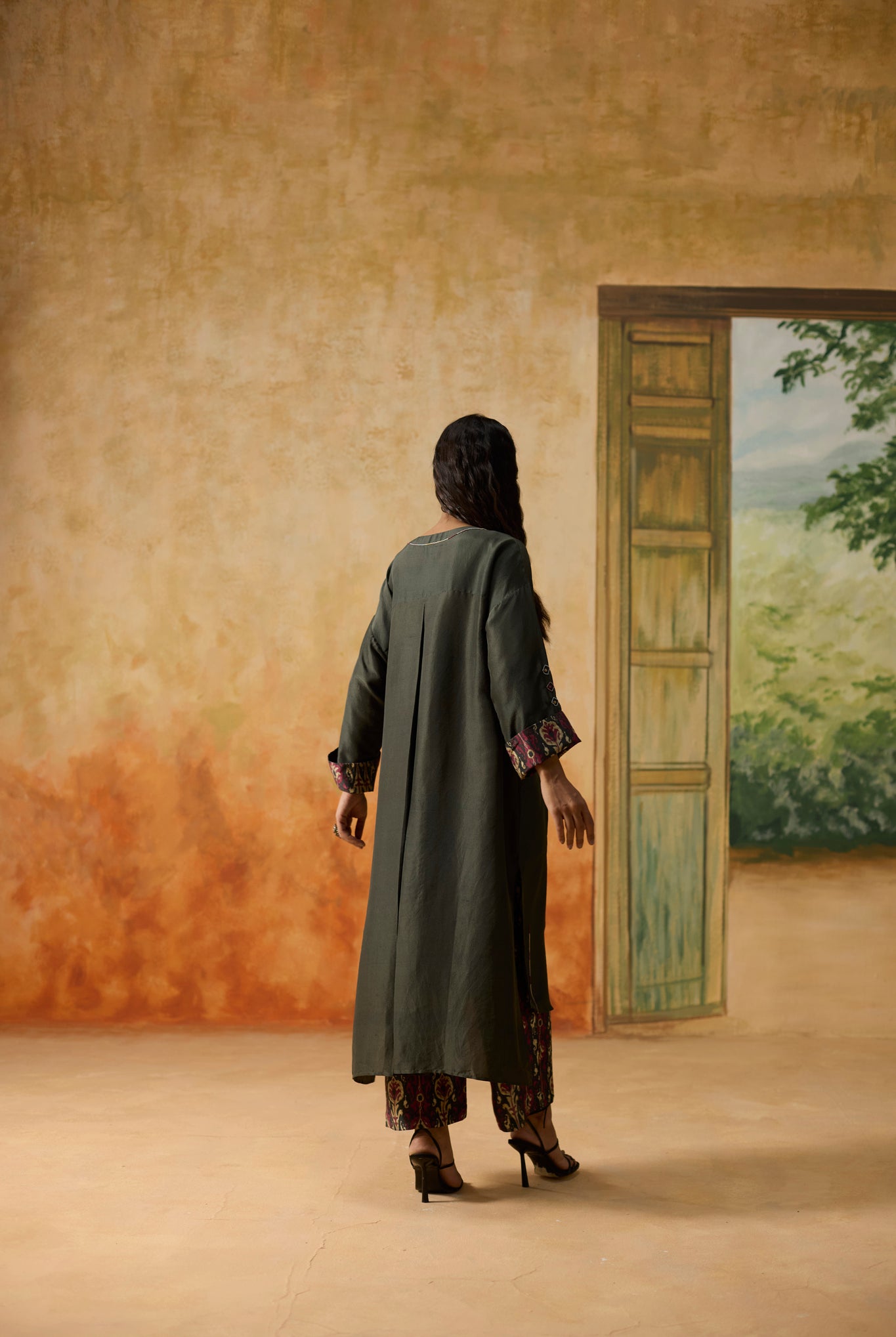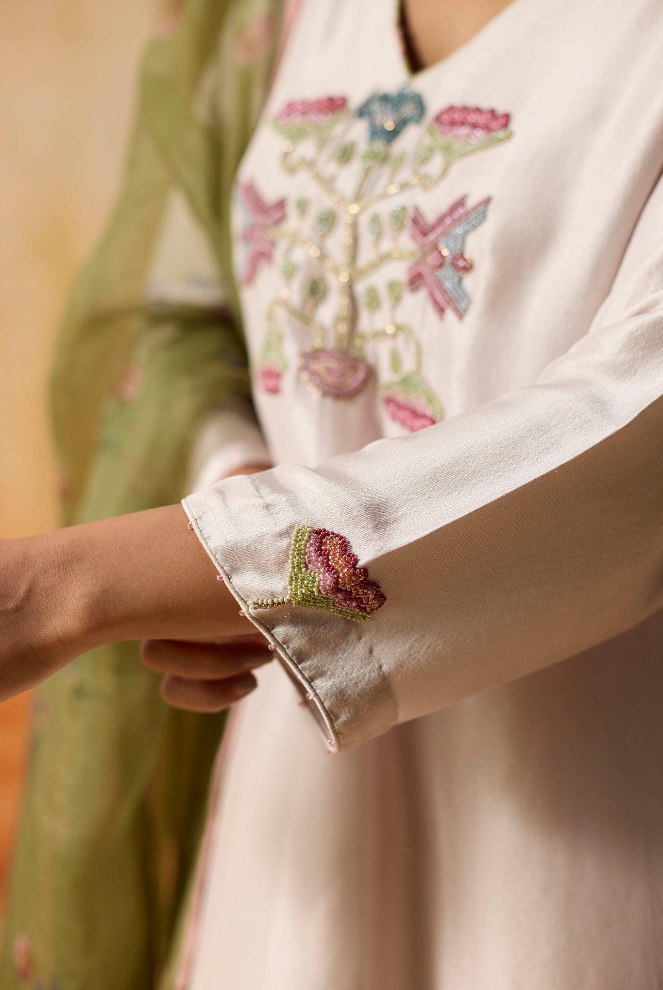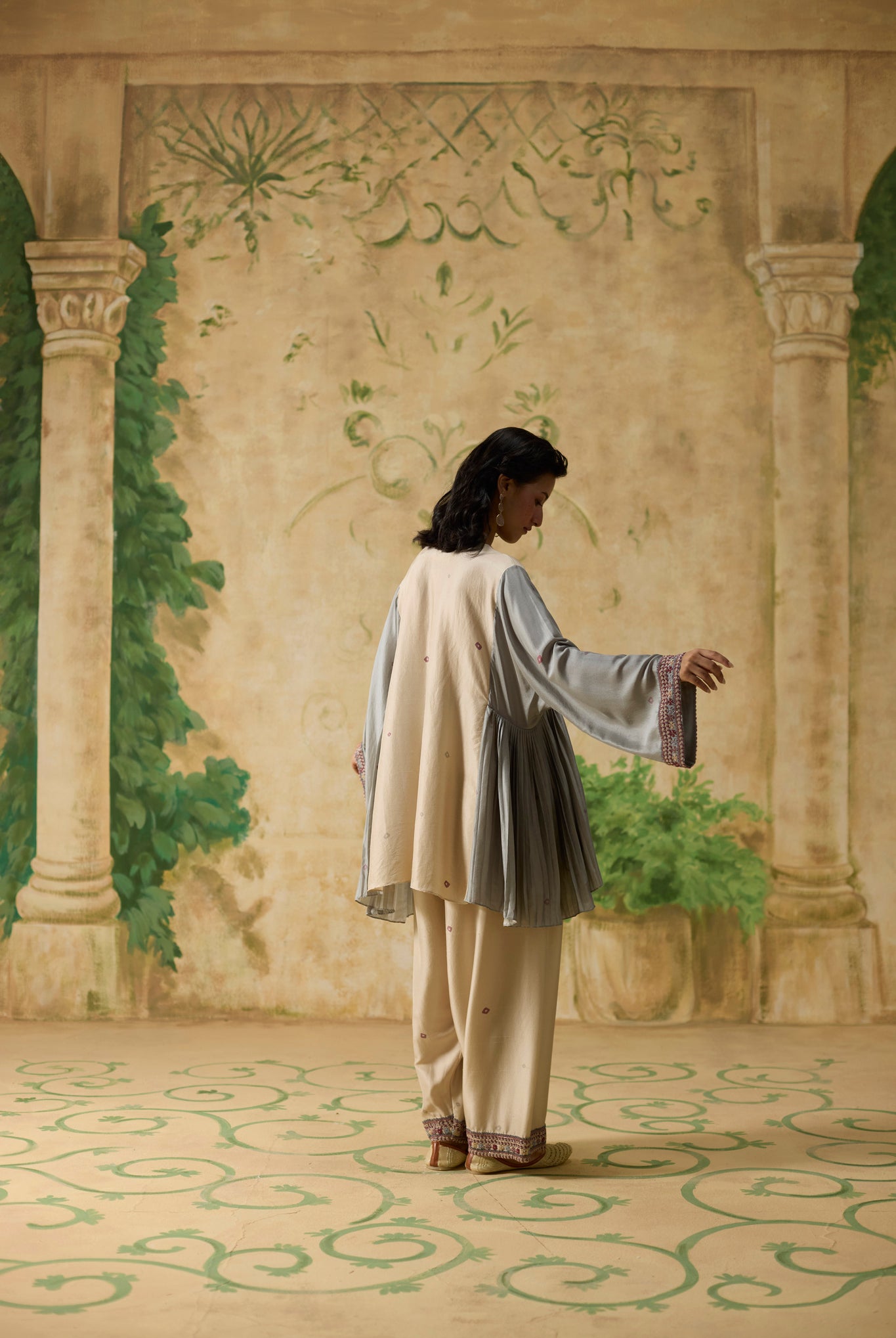 • This Kaftan is a relaxed fit with bandhani print and beaded ikkat on the yoke, side slit with tie detailing.