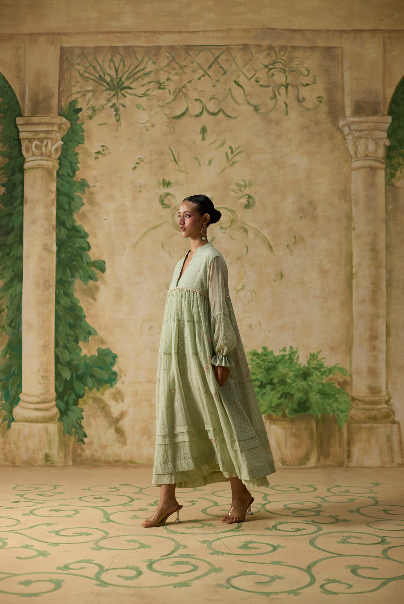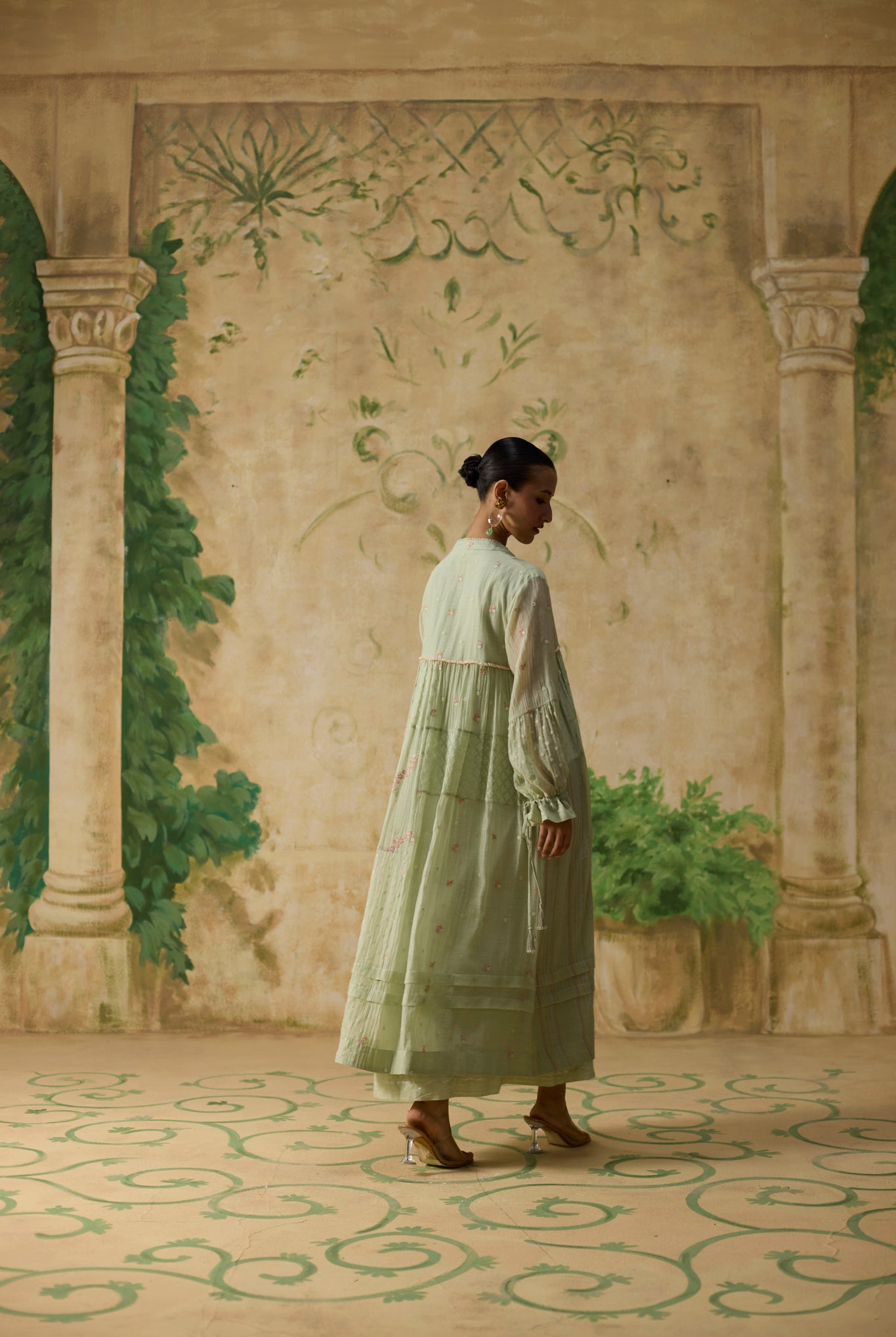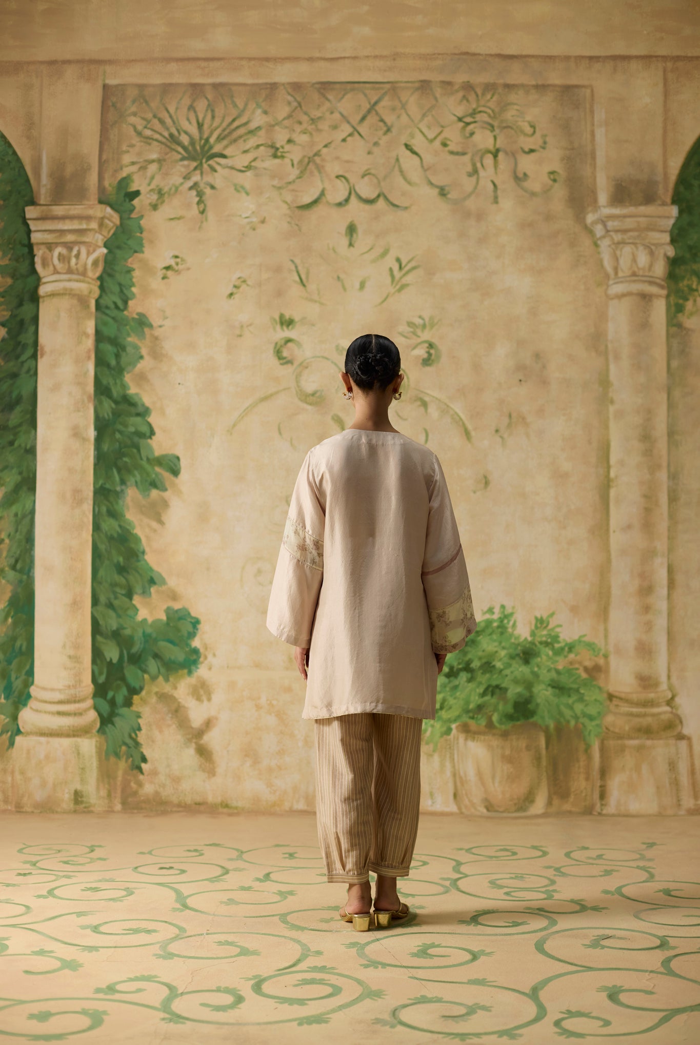 • This Kaftan is a relaxed fit with bandhani print and beaded ikkat on the yoke, side slit with tie detailing.