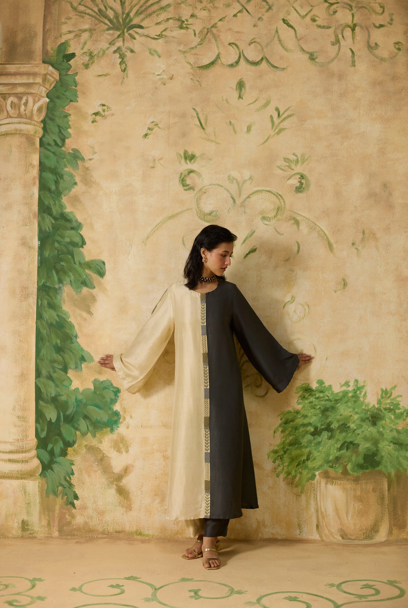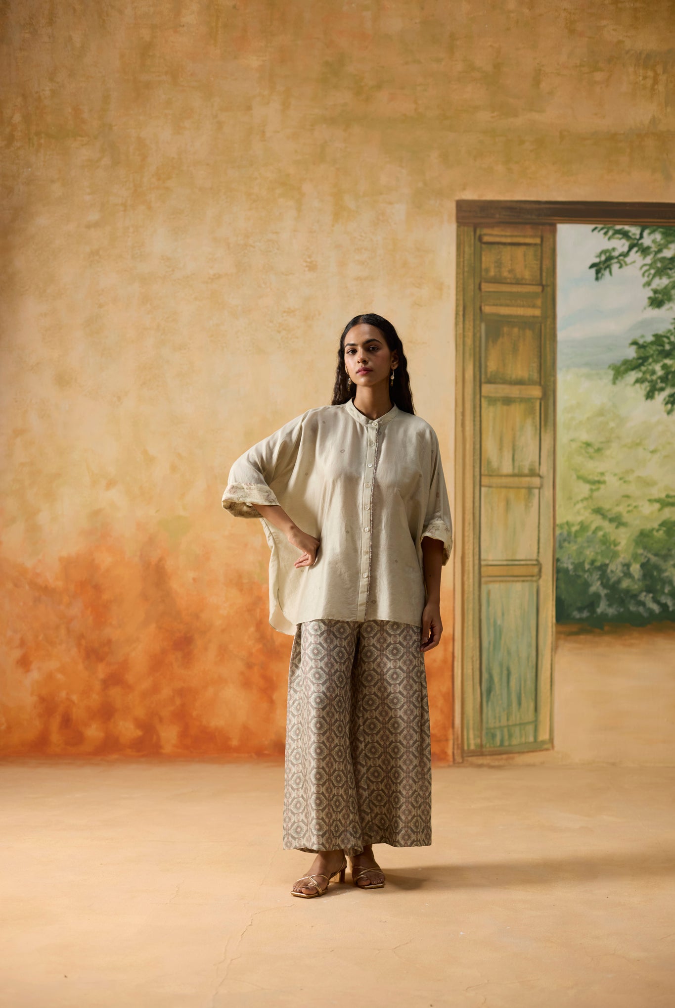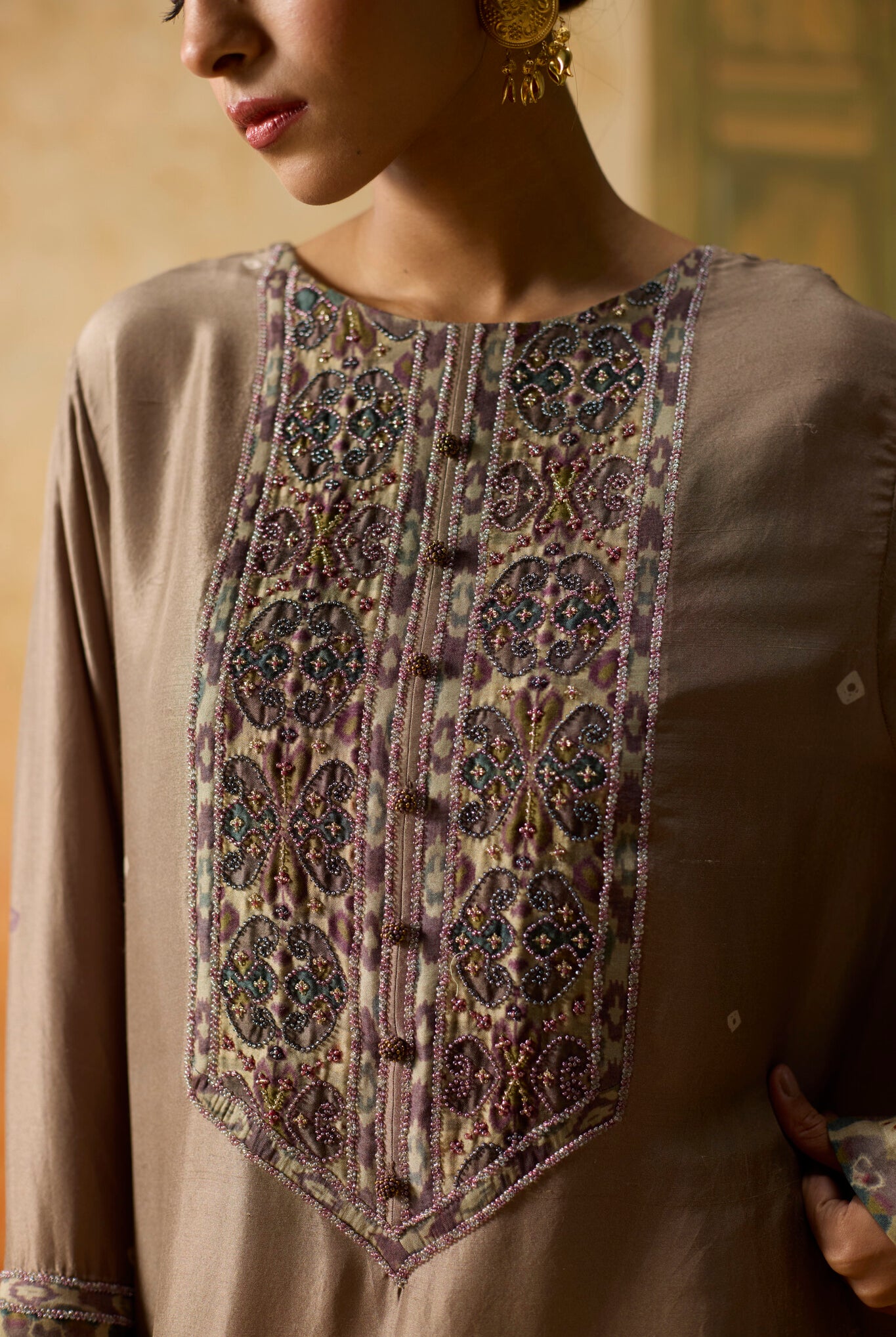 Discover refined elegance in this luxurious silk kaftan, where traditional artistry and modern design converge. The signature bandhani print provides timeless appeal, while the beadwork-embellished ikkat yoke introduces an extra layer of opulence and visual intrigue. A thoughtfully placed slit and delicate tying detail enhance both grace and wearability, complementing the relaxed straight-fit silhouette. Constructed from sumptuous 100% silk, this meticulously crafted piece radiates understated luxury.