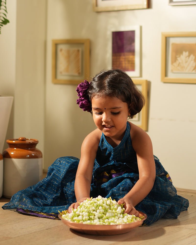 Introduce refined festive style with the Aparajita lehenga set, where contemporary design meets traditional craftsmanship. A striking tiered halter-neck blouse in rich blue complements our signature convertible lehenga skirt, adorned with authentic gold checks woven into handcrafted cotton silk. The thoughtful construction allows seamless transformation from skirt to dress with attached tie-up straps, offering extended versatility.
