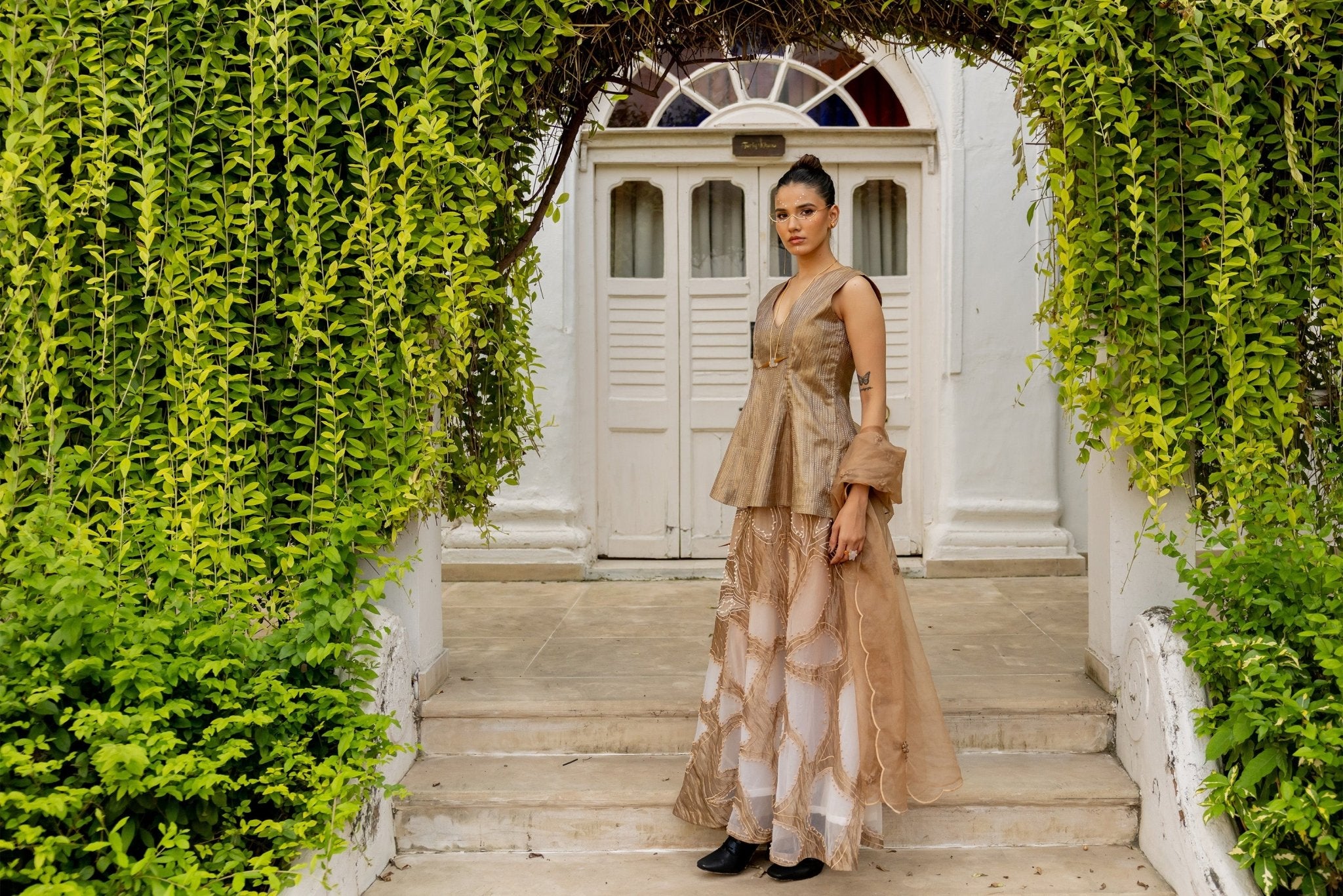 The Julia Set is a three-piece ensemble featuring a sleeveless silk brocade top with deep V neckline and peplum detail in antique gold, paired with a high-waisted Banarasi silk skirt adorned with resham embroidery and cutwork in ombre gold-to-ivory tones. The matching silk organza dupatta showcases handmade floral appliqué work. Crafted from premium natural fabrics with traditional hand-finished detailing throughout.