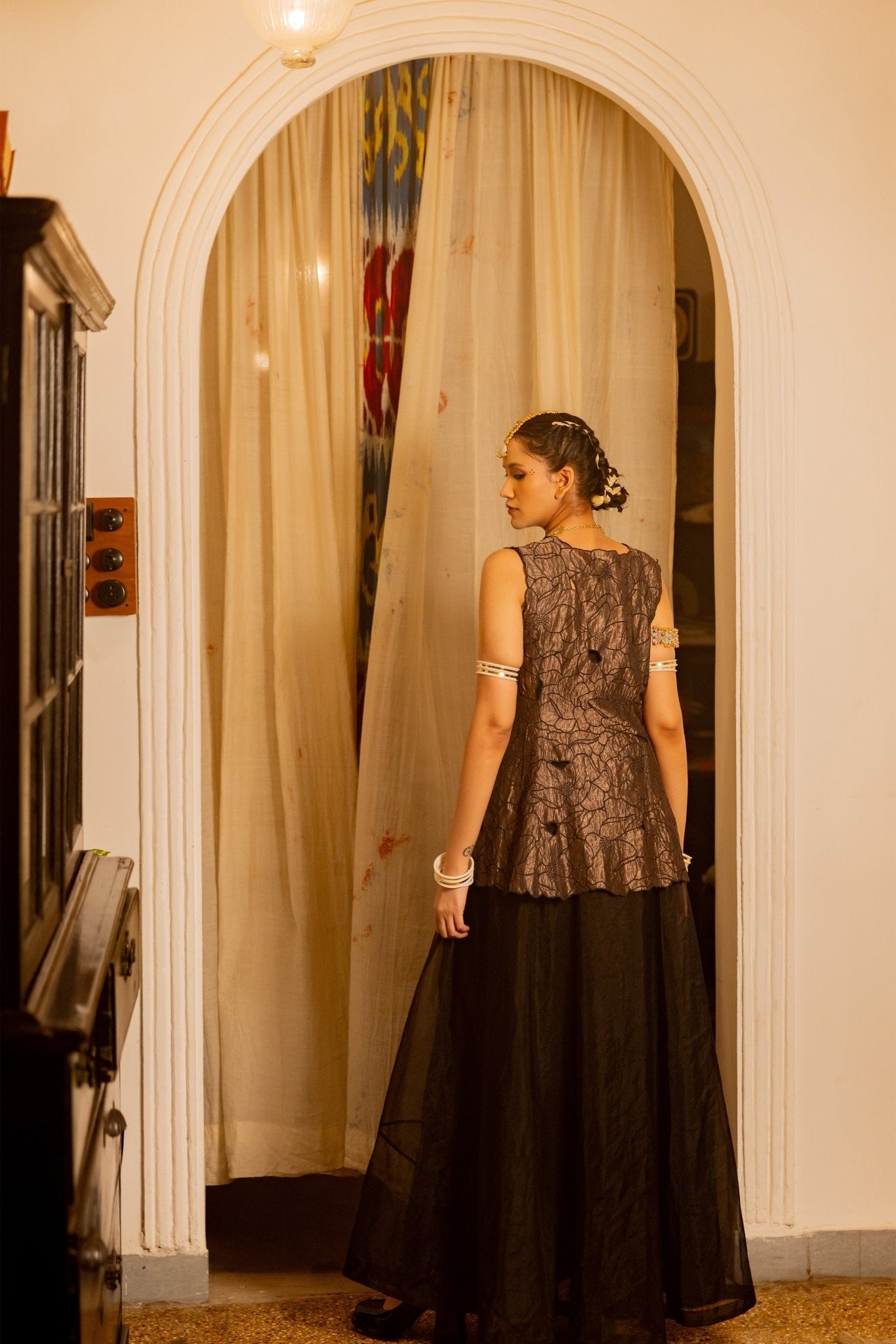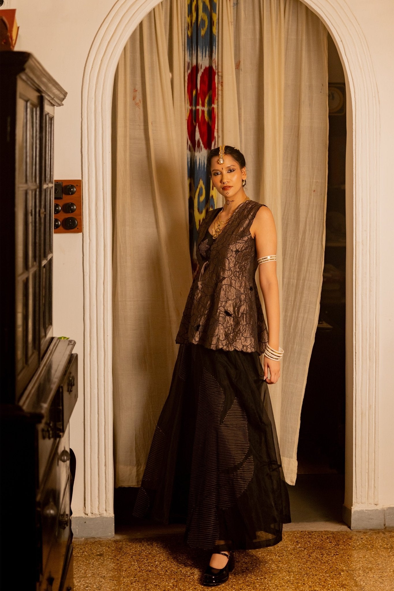 The Vedika Set is a three-piece collection featuring a black and gold embroidered jacket, silk bustier, and high-waisted skirt. Each piece showcases traditional kasab and resham thread work, crafted from pure silk organza and Banarasi silk tissue. Side zip closures and cotton silk linings complete this refined ensemble for special occasions.