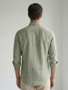 Crafted from 60 Lea European linen, this breathable sage green shirt offers a refined yet effortless look. Designed with a button down collar, full sleeves, barrel cuffs, and a curved hem, it transitions easily from casual to smart-casual wear. Handmade and timeless, it only gets softer with every wash.