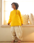 Discover understated elegance with the Basant kurta, a celebration of thoughtful design in radiant yellow. This festive piece showcases a distinctive side button placket that elevates its silhouette with contemporary flair, while the back features an exquisite pink and gold selvedge detail that adds depth and visual interest. Crafted for those who value both comfort and style, it combines ease of wear with refined aesthetics. Practical pockets ensure functionality without compromising on sophistication.