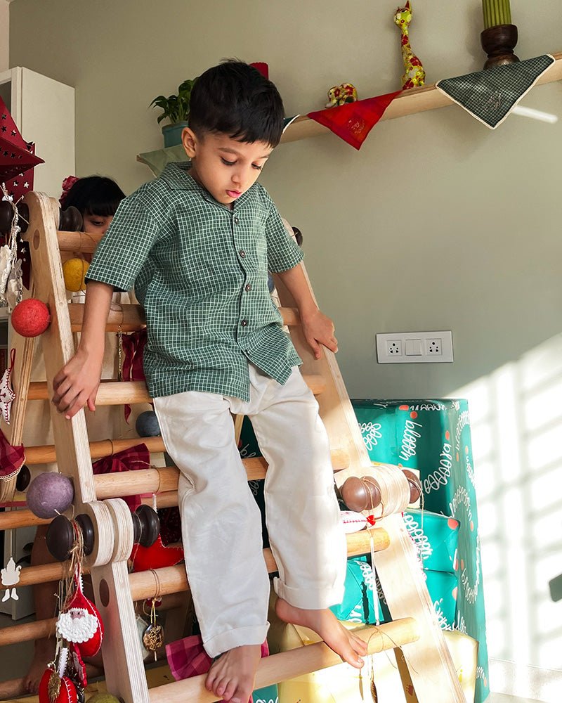 Embrace effortless elegance with this handwoven cotton shirt, crafted for the modern boy who values both comfort and style. The relaxed fit ensures all-day wearability, while the distinctive Cuban collar adds a touch of refined sophistication. Finished with natural wooden buttons and a vibrant green checkered pattern, this piece seamlessly transitions from casual outings to more polished occasions. Premium handwoven construction delivers durability and texture that elevates any wardrobe.