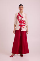 Where ease meets elegance, the Malaca set delivers understated impact. An ivory top blooming with crimson florals flows into rich red wide-leg pants, a composition of movement and restraint. The relaxed tie neckline softens the silhouette while delicate embroidery adds quiet confidence. Designed for those who celebrate without fanfare, this pairing balances airiness with polish for occasions that call for refined grace.
