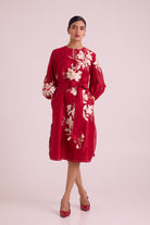 The Sarla midi dress embodies understated sophistication in a rich apple red palette. Its thoughtfully designed silhouette features a self-tie waist that adapts to your frame and soft blouson sleeves that balance structure with ease. Delicate ivory florals grace the fabric, introducing subtle artistry without overwhelming the clean lines. This is a dress for those who value composed elegance, versatile enough for professional settings, refined enough for social occasions, and designed to make you feel effortlessly put-together.