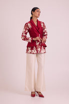 Command authority with artistic grace. The Vasco set pairs a tailored crimson blazer adorned with ivory florals against structured wide-leg ivory pants, a power suit that refuses to whisper. Structured seaming meets fluid draping; assertive tailoring embraces feminine softness. Perfect for boardrooms, events, or moments when you need to look sharp without sacrificing soul. Business-ready, beautifully rendered.