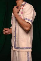 Effortlessly stylish and thoughtfully crafted, this linen camp collar shirt features bold detailing. The easy fit and short sleeves make it perfect for warm days, while the elegant borders add a touch of refinement to any occasion. Paired with comfortable lounge pants, this set offers both comfort and standout style.