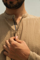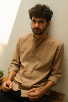 Discover refined simplicity in this men's shirt, featuring a distinctive chatai weave, a self-checkered pattern perfected by West Bengal's master weavers. Naturally dyed cotton delivers subtle depth and authenticity, while the band collar and selvedge-trimmed button placket showcase meticulous artisanal detailing. A sophisticated choice for those who appreciate the quiet confidence of handcrafted textiles.