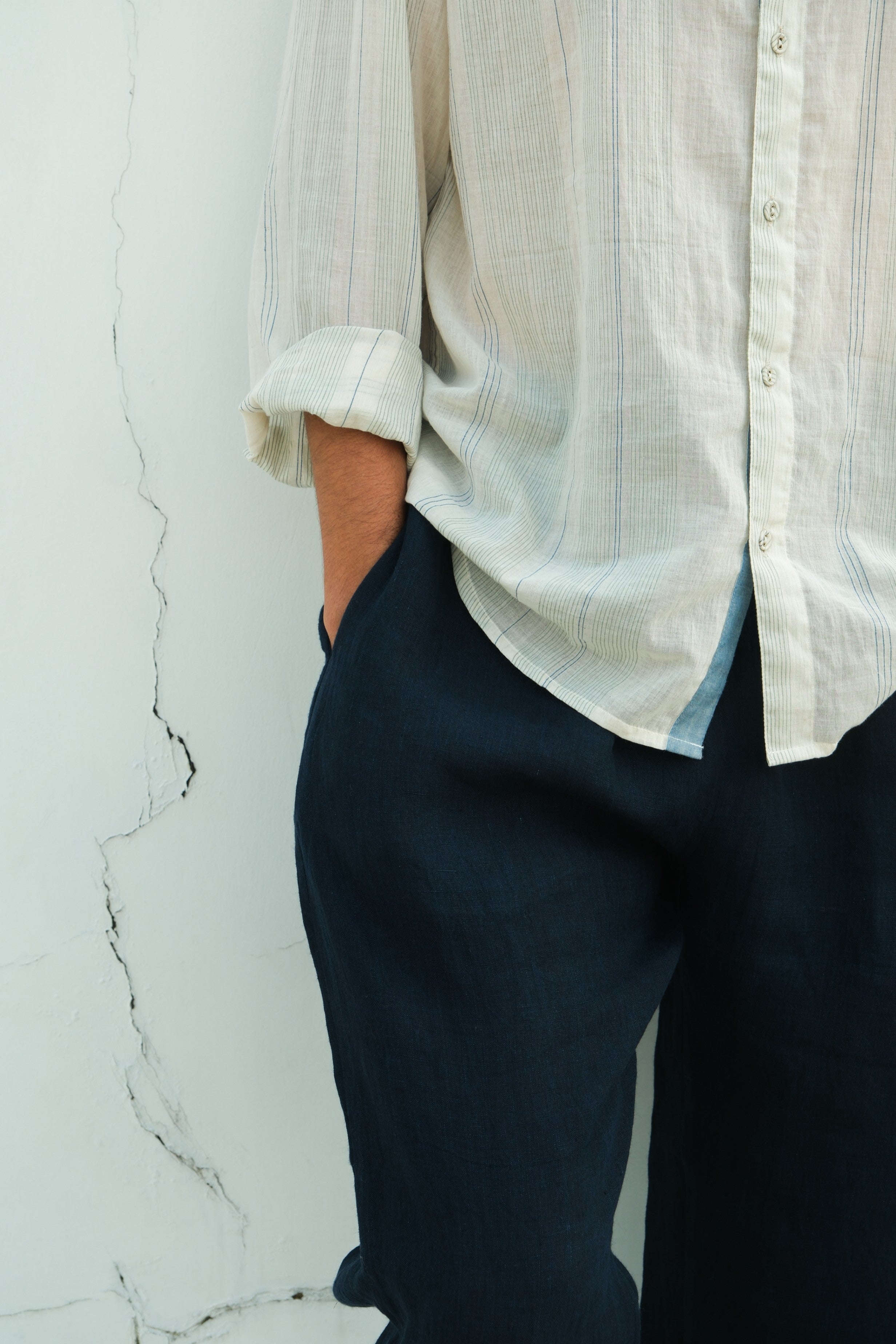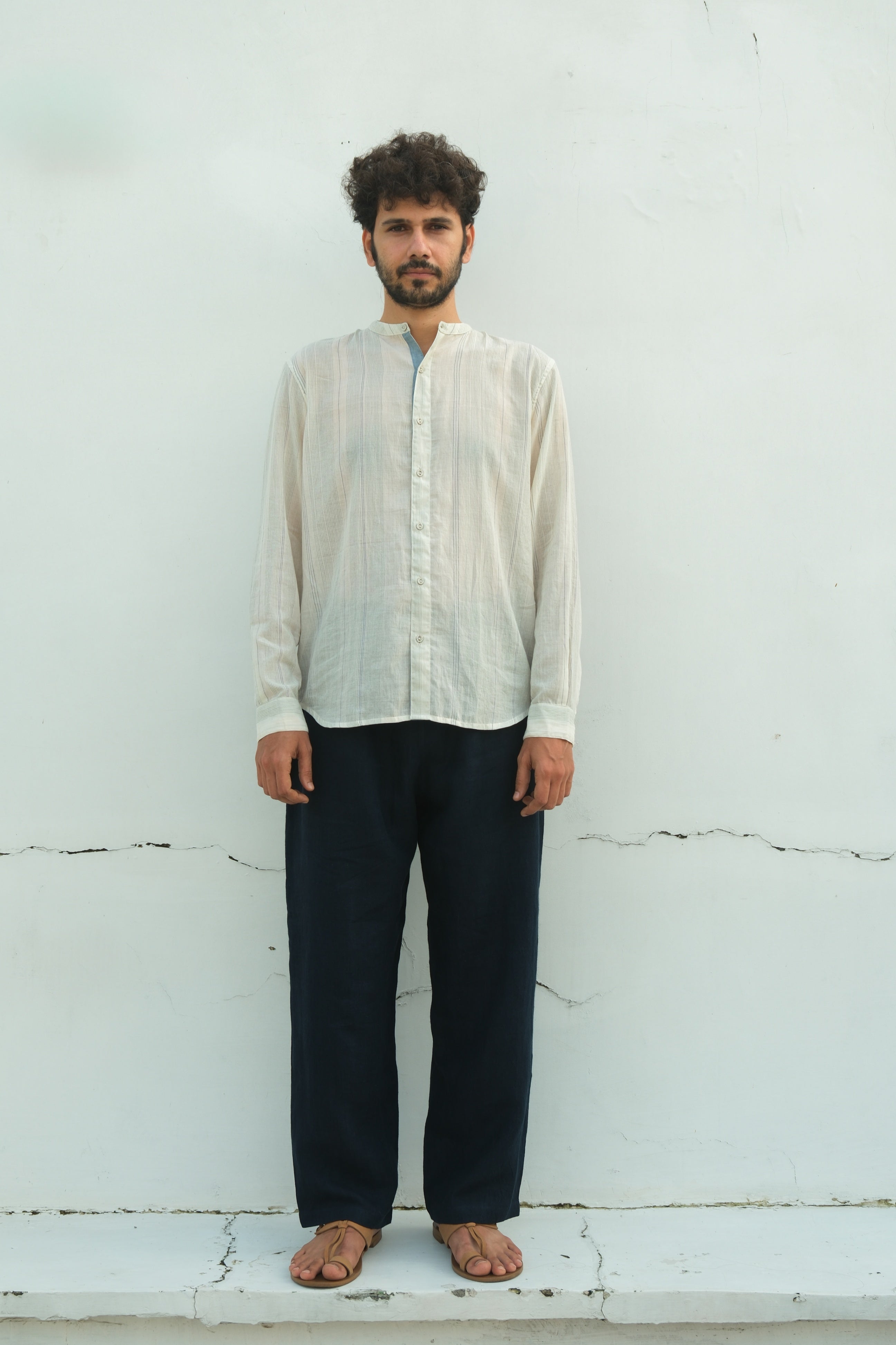 Subtle stripes in naturally dyed indigo and green weave through this breathable cotton shirt from West Bengal, striking an elegant balance between understated and visually engaging. Cut with full sleeves, a refined band collar, and structured box pleats, the Drift offers timeless sophistication. Naturally occurring variations in the stripe pattern and authentic selvedge detailing underscore its artisanal heritage, a piece that rewards closer inspection.