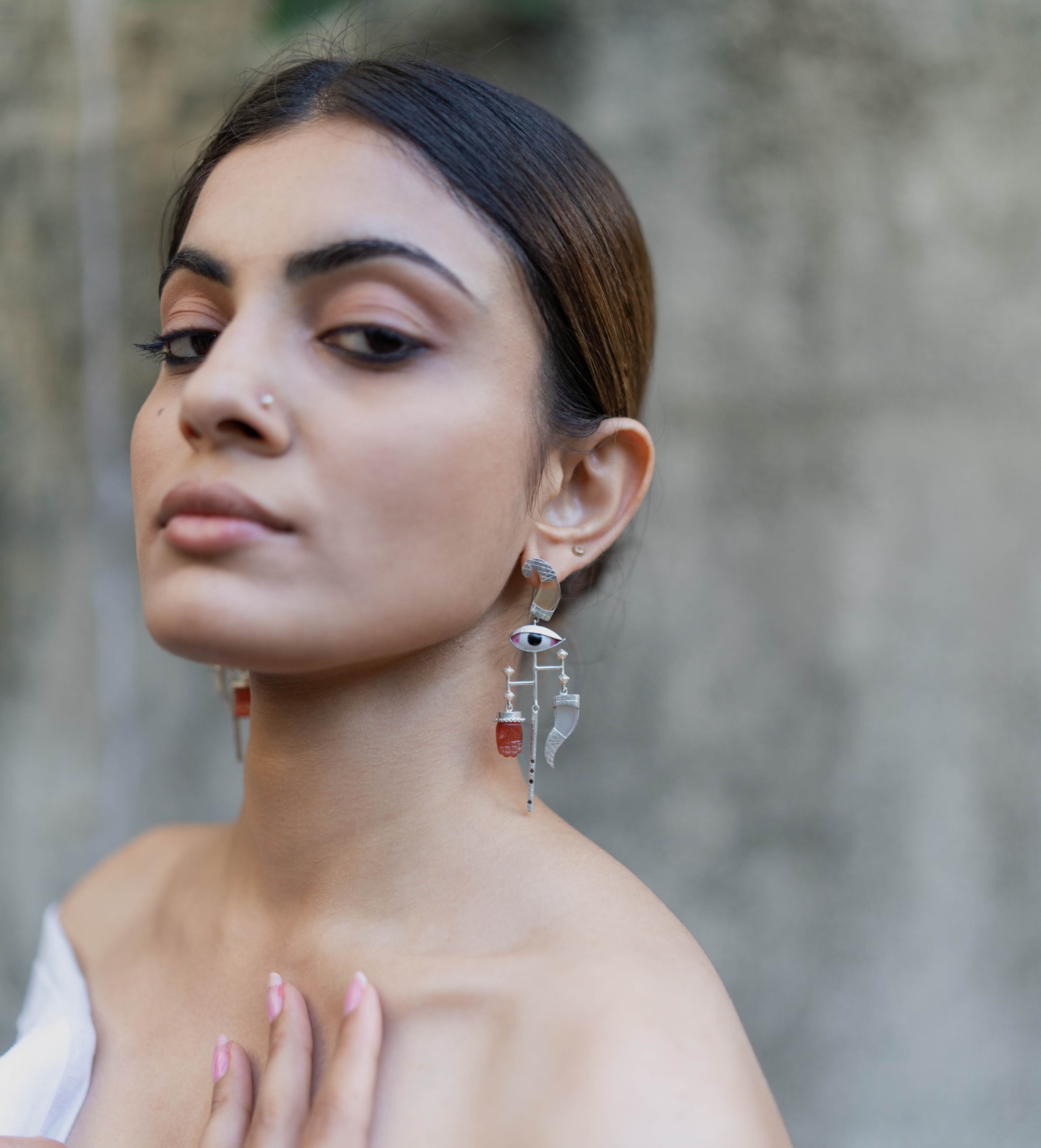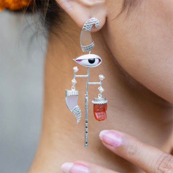 This lovely pair of statement earrings is inspired by the Gopashtami ki Pichwai, whose elements it deconstructs and takes forward as jewellery. Accordingly, it features two silhouettes of cow horns set in our custom silver setting. The entire piece is embellished with seed pearls and set in silver. Shreenathji's presence in this vignette is symbolized through a traditional enamelled Netra and a hand carved carnelian hand. Don't miss the eyelid detail which is a unique setting we developed. The earrings are very light weight and move beautifully.