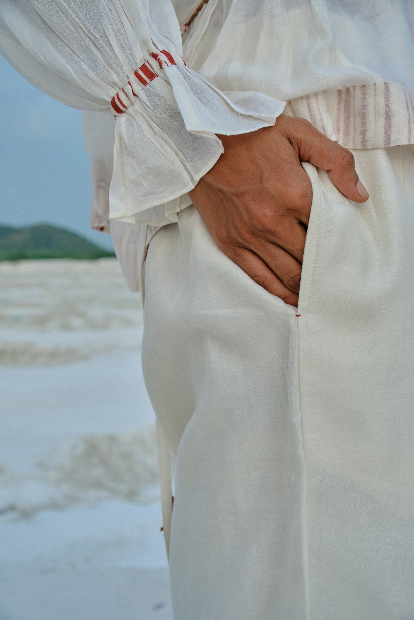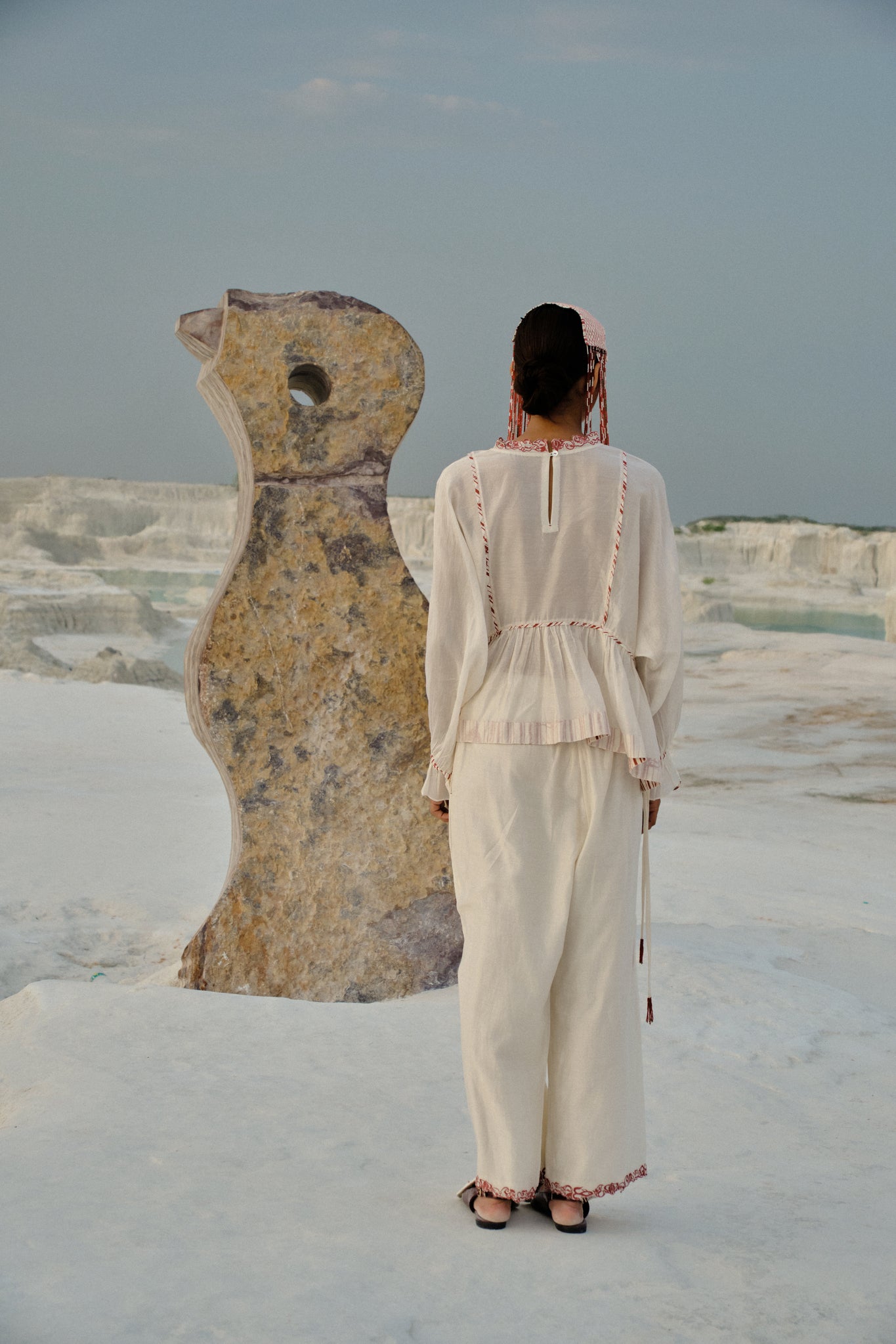 The Aye Dolman Top merges relaxed comfort with refined craftsmanship in a luxurious cotton-silk blend. Hand-embroidered neckline detailing showcases artisanal skill, while a structured panelled yoke and precise binding define the front and back. Softly gathered flares create graceful movement, and tie-up sleeves adorned with handcrafted tassels introduce an element of curated sophistication to this effortlessly elegant piece.