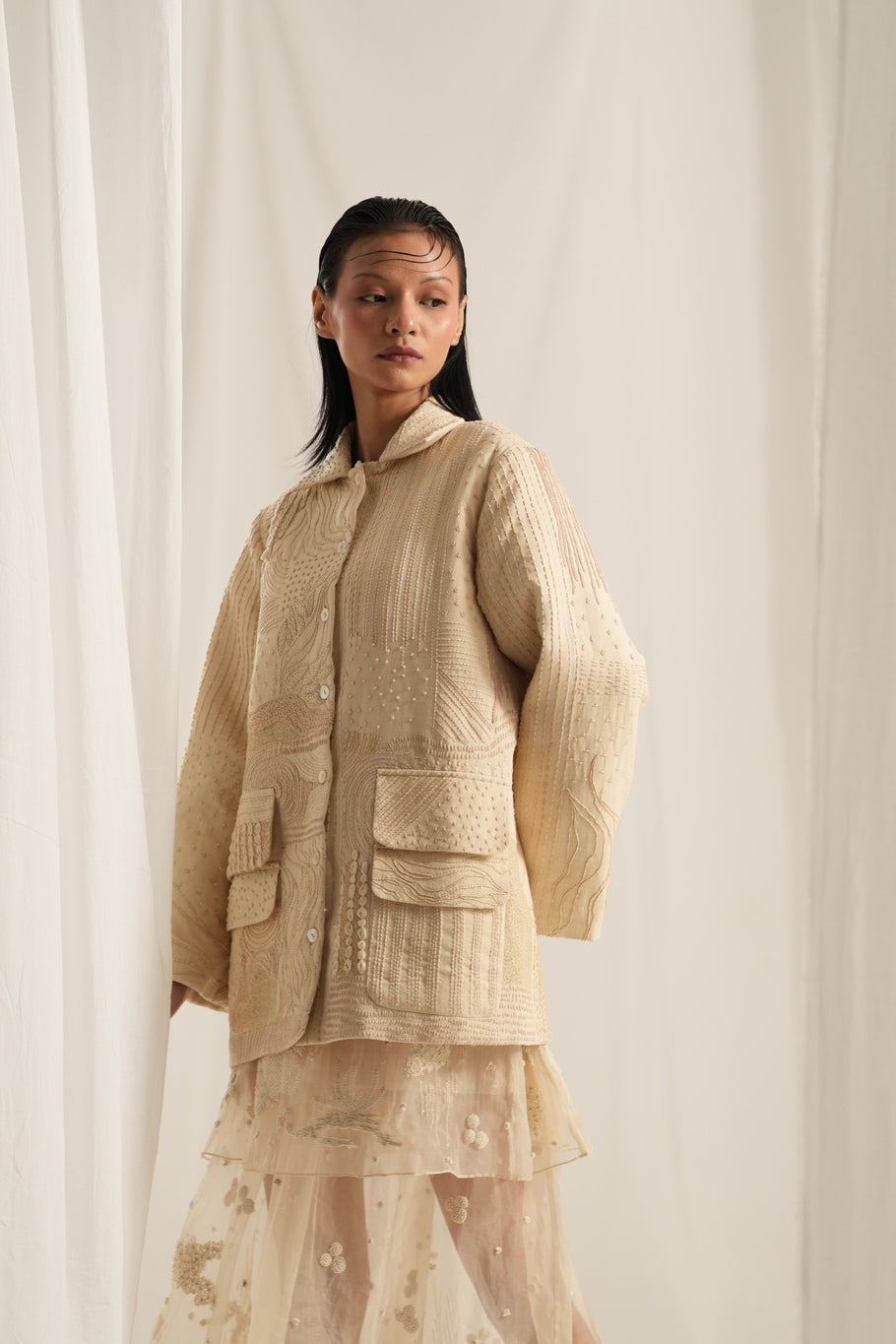 Crafted in soft shades of ivory and beige, this jacket features intricate Kantha work that creates a beautiful array of textures, making each piece unique. The finely constructed design includes convenient pockets on both front panels.With a front-open style, this jacket is versatile enough to layer over your favorite outfits.