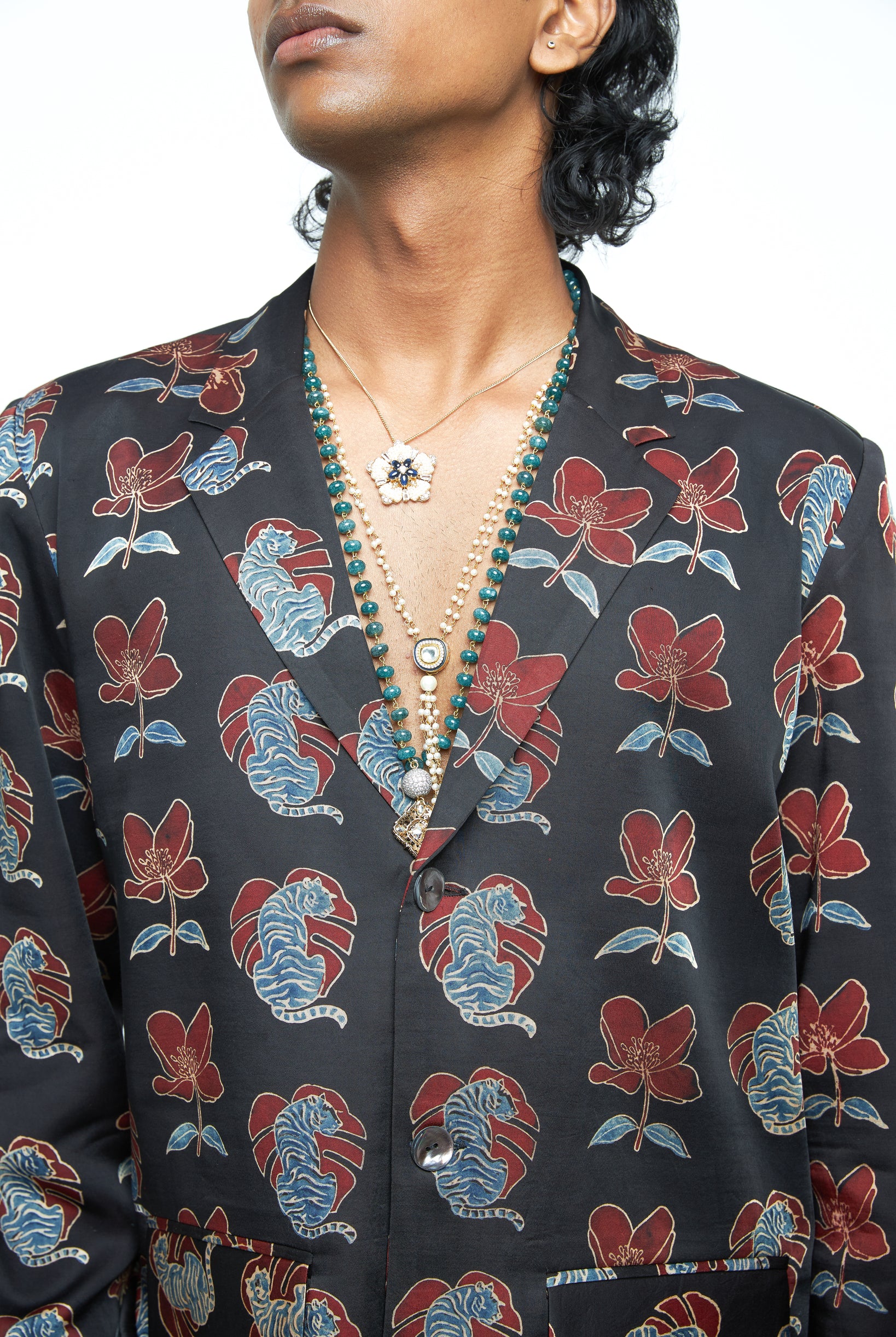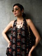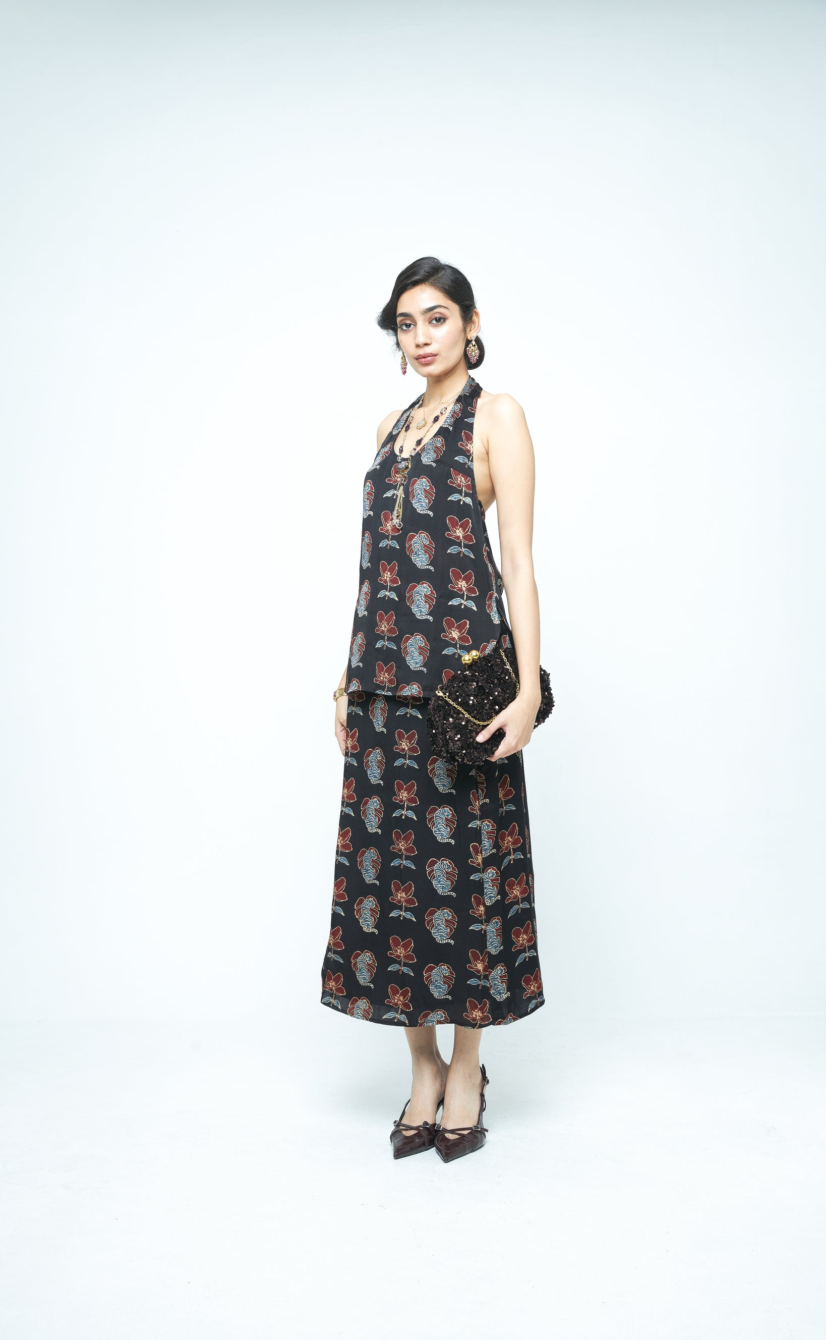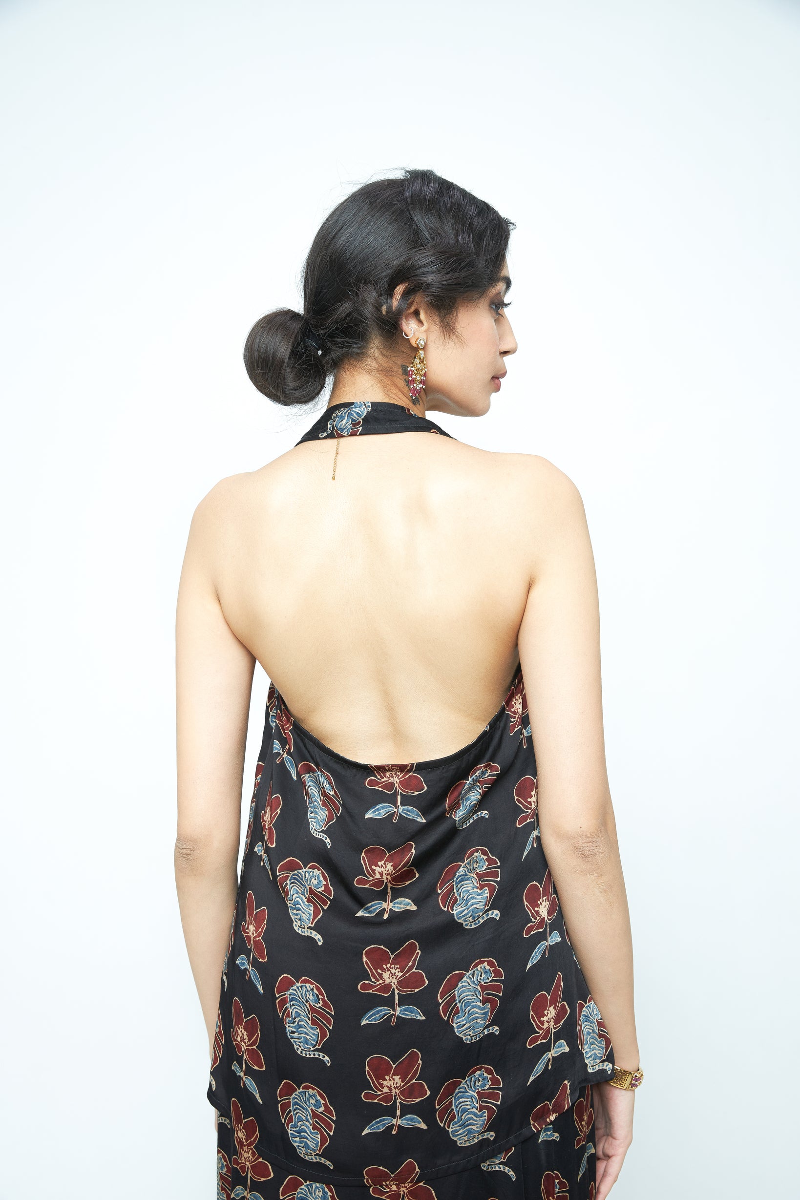 This halter top is a sleek expression of bold artistry and contemporary ease. Crafted from soft modal fabric, it features the striking Blooming Beast print, bringing a vibrant, modern edge to a clean, refined silhouette. Designed with a halter neckline, it frames the shoulders beautifully while maintaining an effortless sense of movement. Side slits enhance comfort and fluidity, while a discreet side zipper ensures a seamless fit.