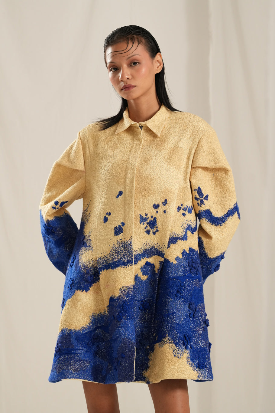 This stunning hand-embroidered dress, crafted from soft cotton for ultimate comfort. The exquisite surface texture, reminiscent of a painting, features beautiful hues of beige, cream, and blue, making it a true statement piece. With a front zipper, convenient side pockets, and light shoulder pads for added structure, this dress combines style and functionality effortlessly.