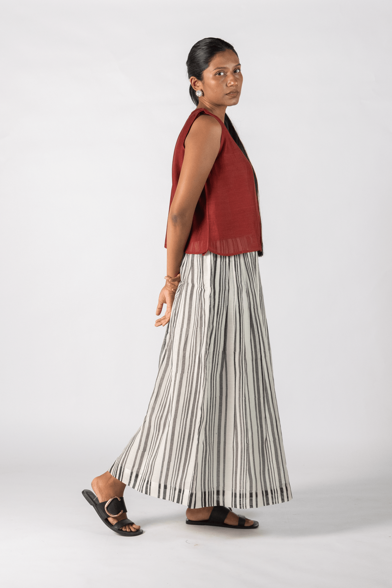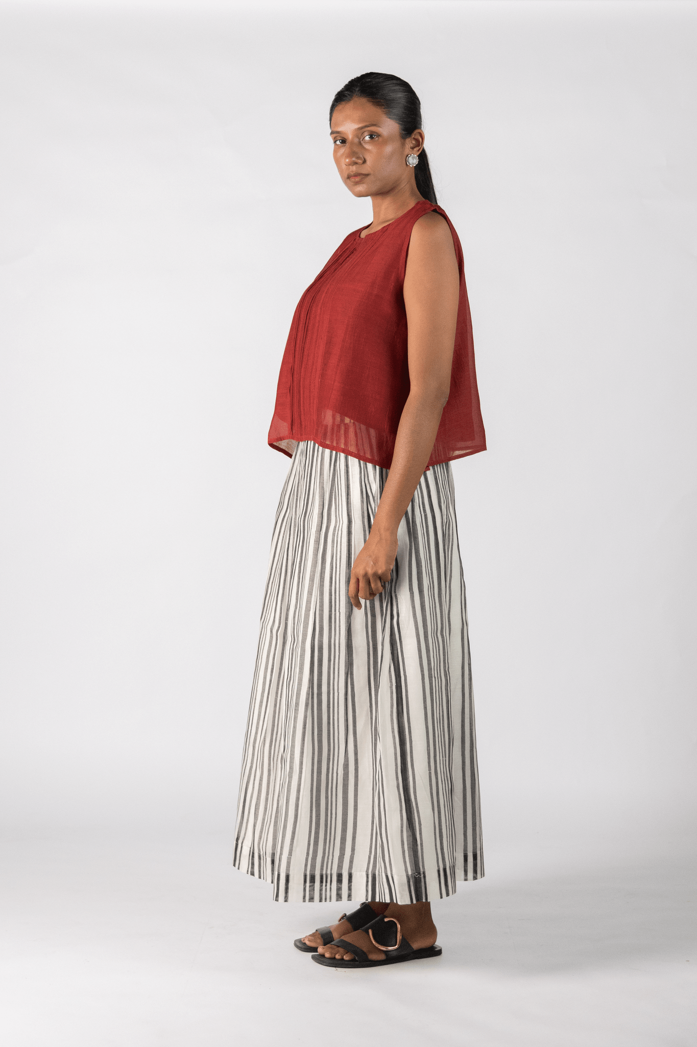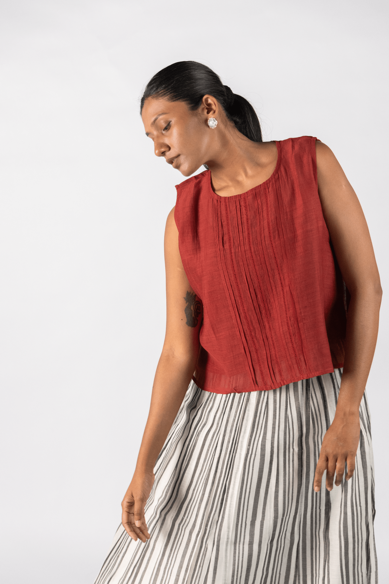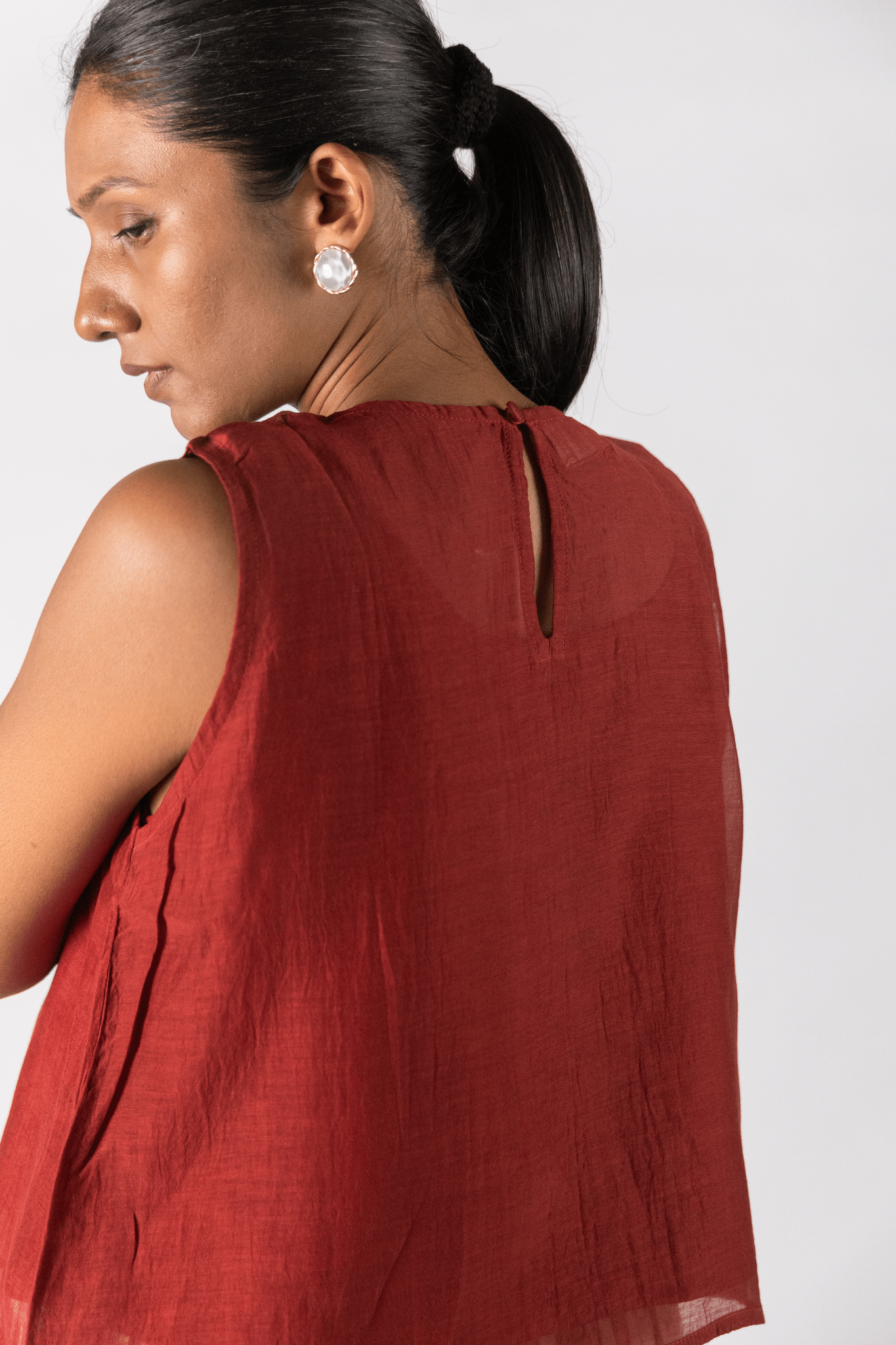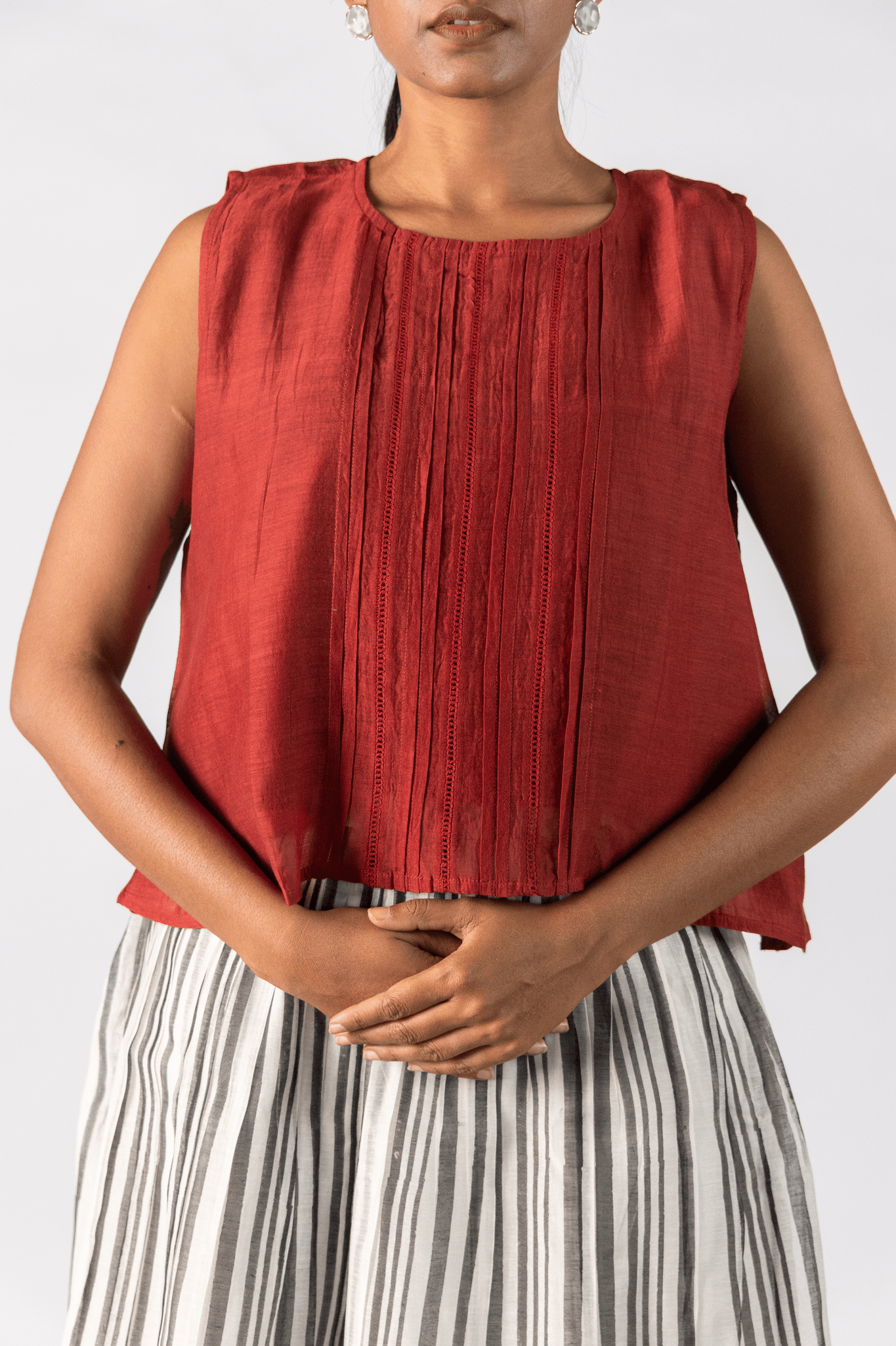 Crafted in lightweight Mul Chanderi (cotton–silk blend), this maroon top features a round neck with soft front pleats and a delicate button loop closure at the back. Comes with a breathable cotton slip for all-day comfort.