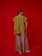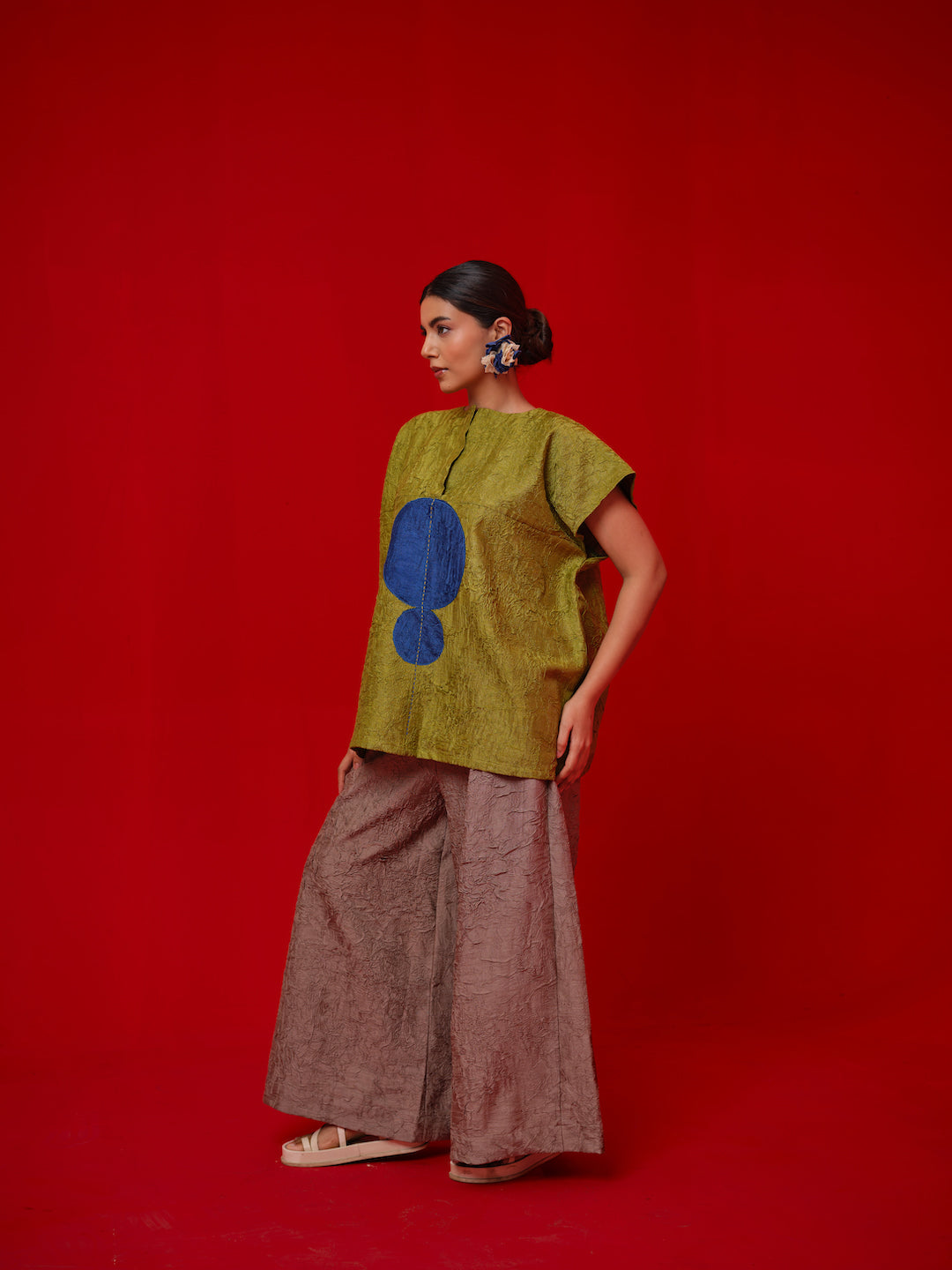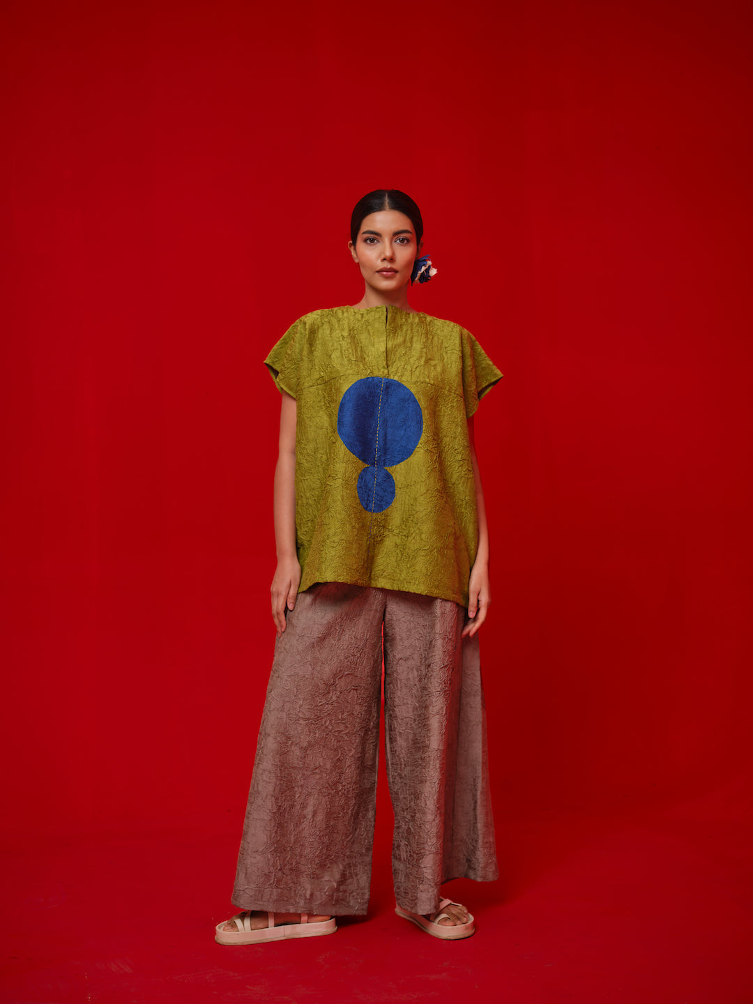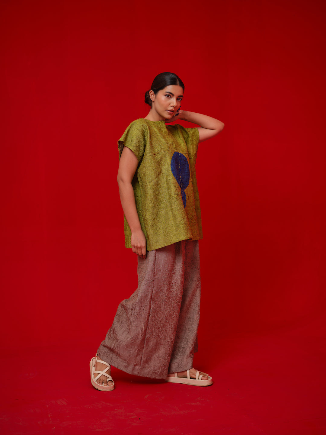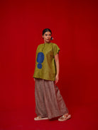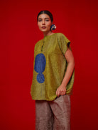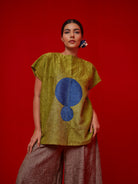 A one-size top crafted in hand-crushed silk, made in-house for its unique texture and fluid drape. It features a hand-embroidered circular appliqué rendered in traditional Kantha stitching—each motif individually crafted by our artisans. The relaxed silhouette and artisanal detail make it a statement of ease and craftsmanship.