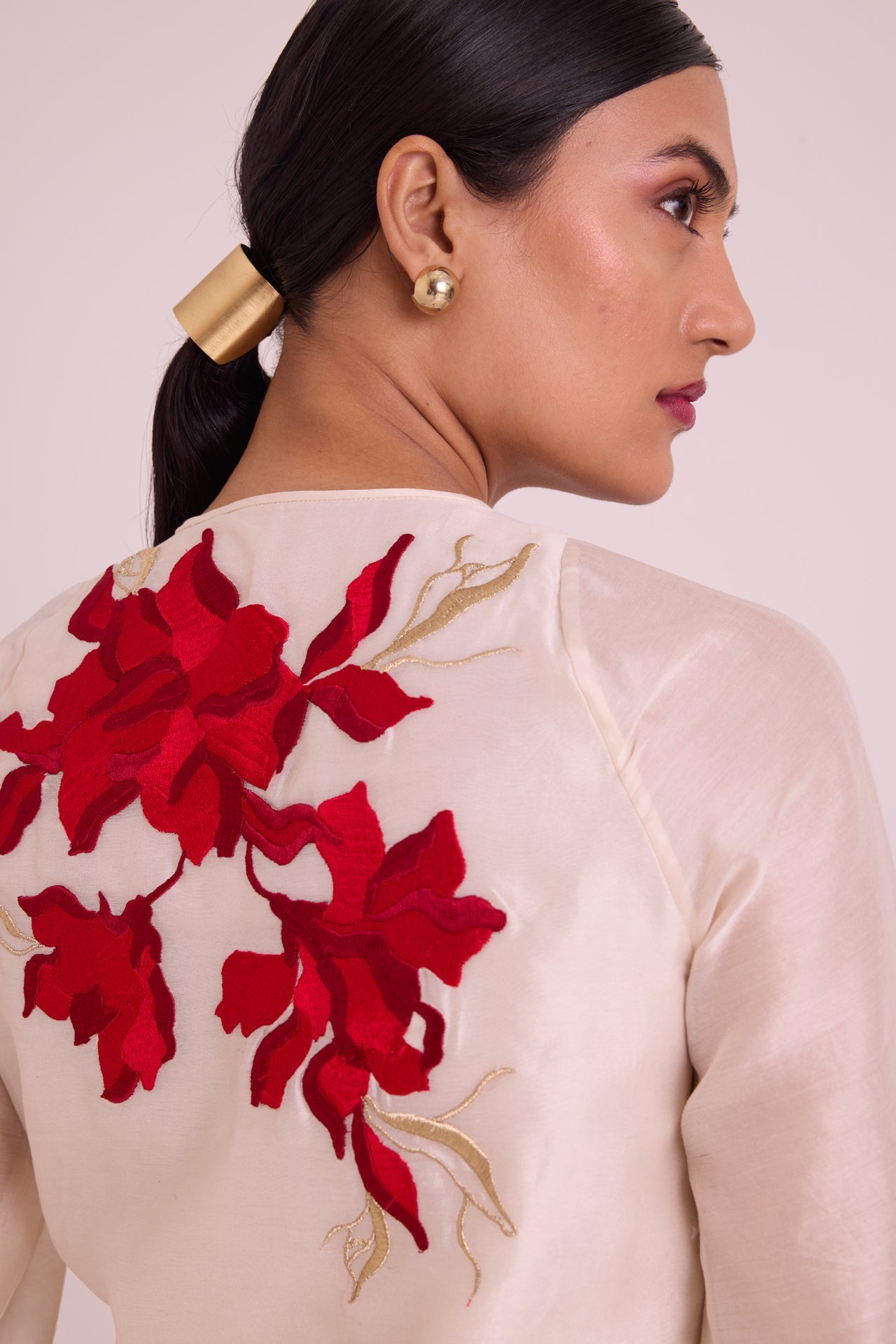 Where ease meets elegance, the Malaca set delivers understated impact. An ivory top blooming with crimson florals flows into rich red wide-leg pants, a composition of movement and restraint. The relaxed tie neckline softens the silhouette while delicate embroidery adds quiet confidence. Designed for those who celebrate without fanfare, this pairing balances airiness with polish for occasions that call for refined grace.