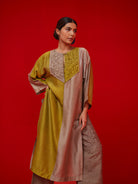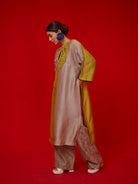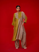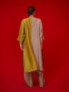 Relaxed free size tunic made in silk features a color blocking detail, and hand made patchwork detail