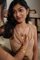 Inspired by the Kashmiri red stag, the Ruhani Necklace symbolises grace and quiet strength. Handcrafted in brass with 18k gold plating and set with natural emeralds, it reflects nature’s soulful beauty.